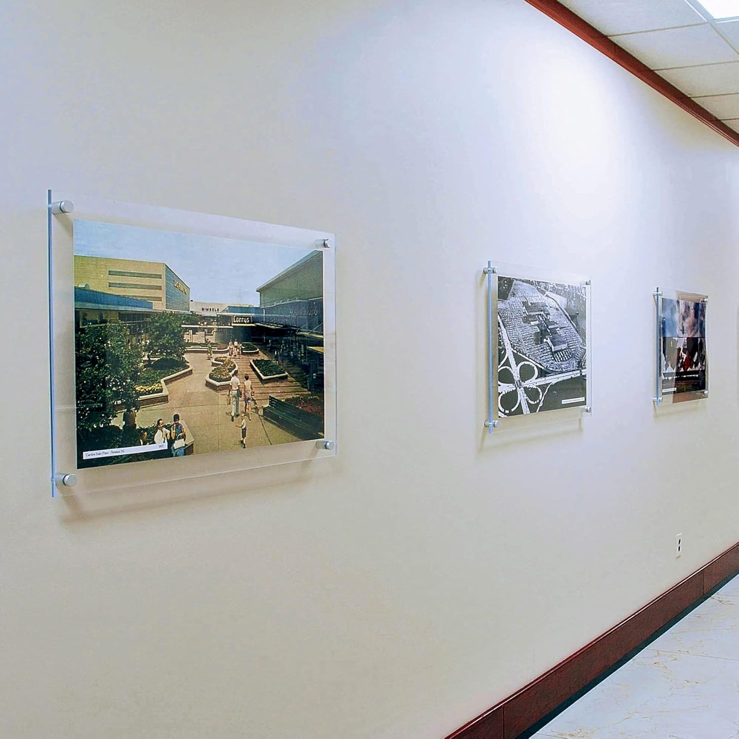- STRONG AND DURABLE - This floating frame includes six 1 Inch silver diameter aluminum standoffs and caps, and four all purpose screws with anchors for a strong mount that will hold up to high traffic areas.