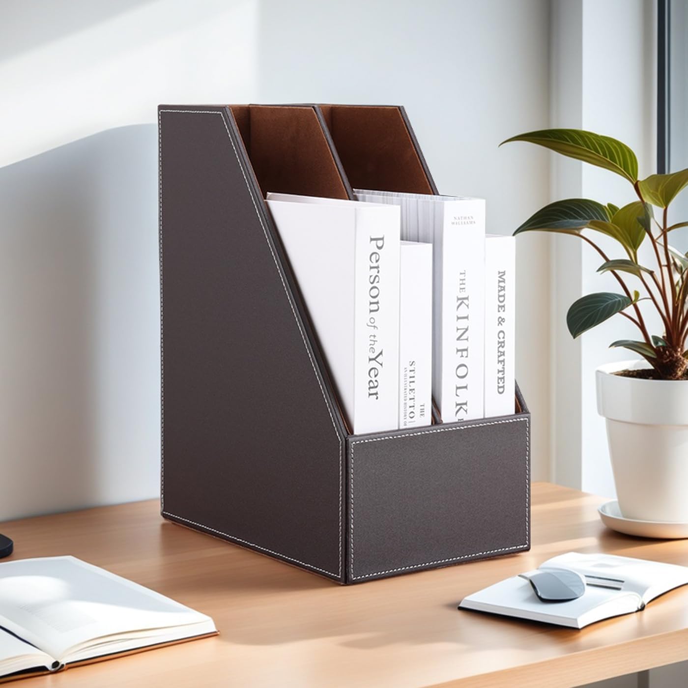 KINGFOM Wooden Leatherette Desktop File Folder Organizer and Document File Stand Journals Magazine Rack 2 Slots (brown)