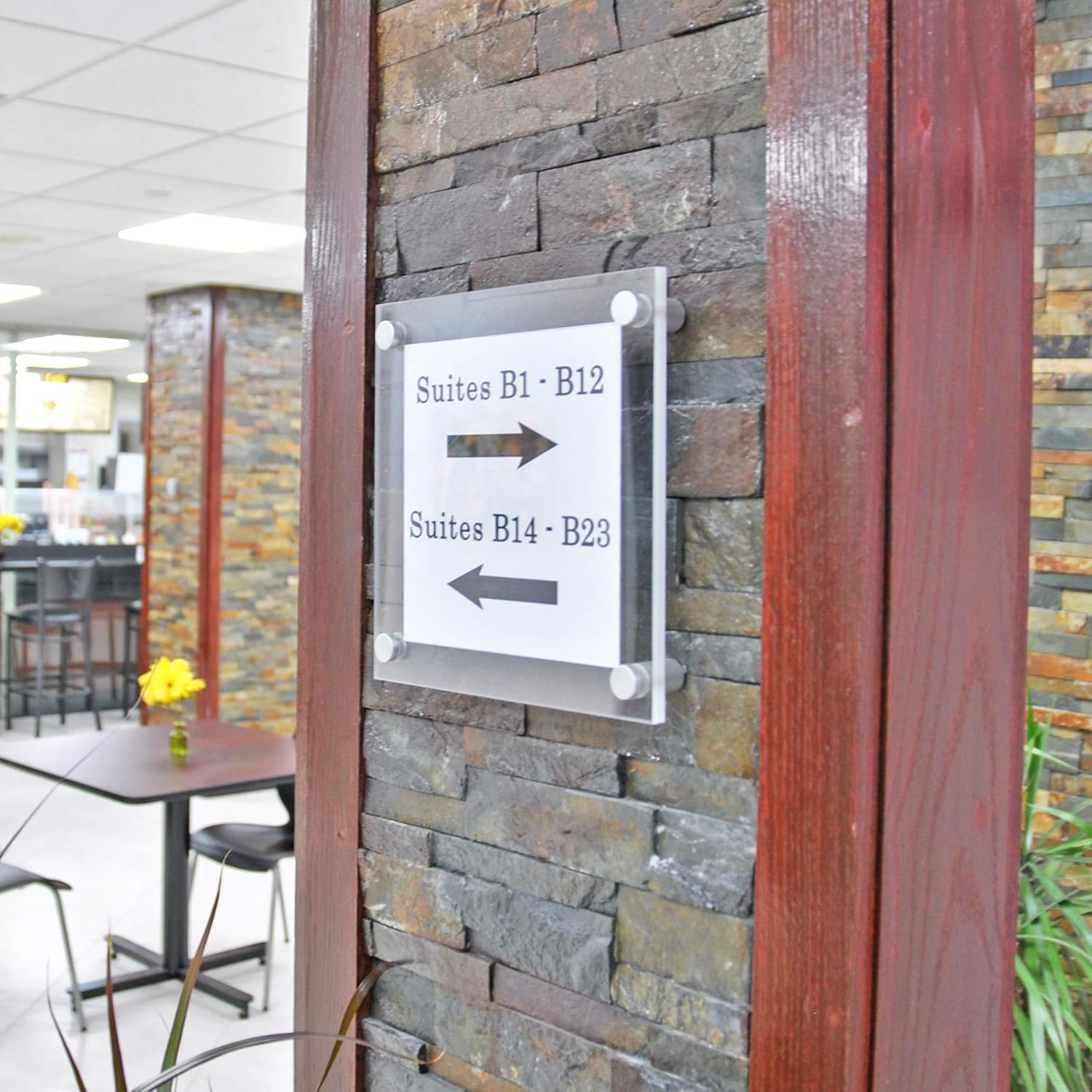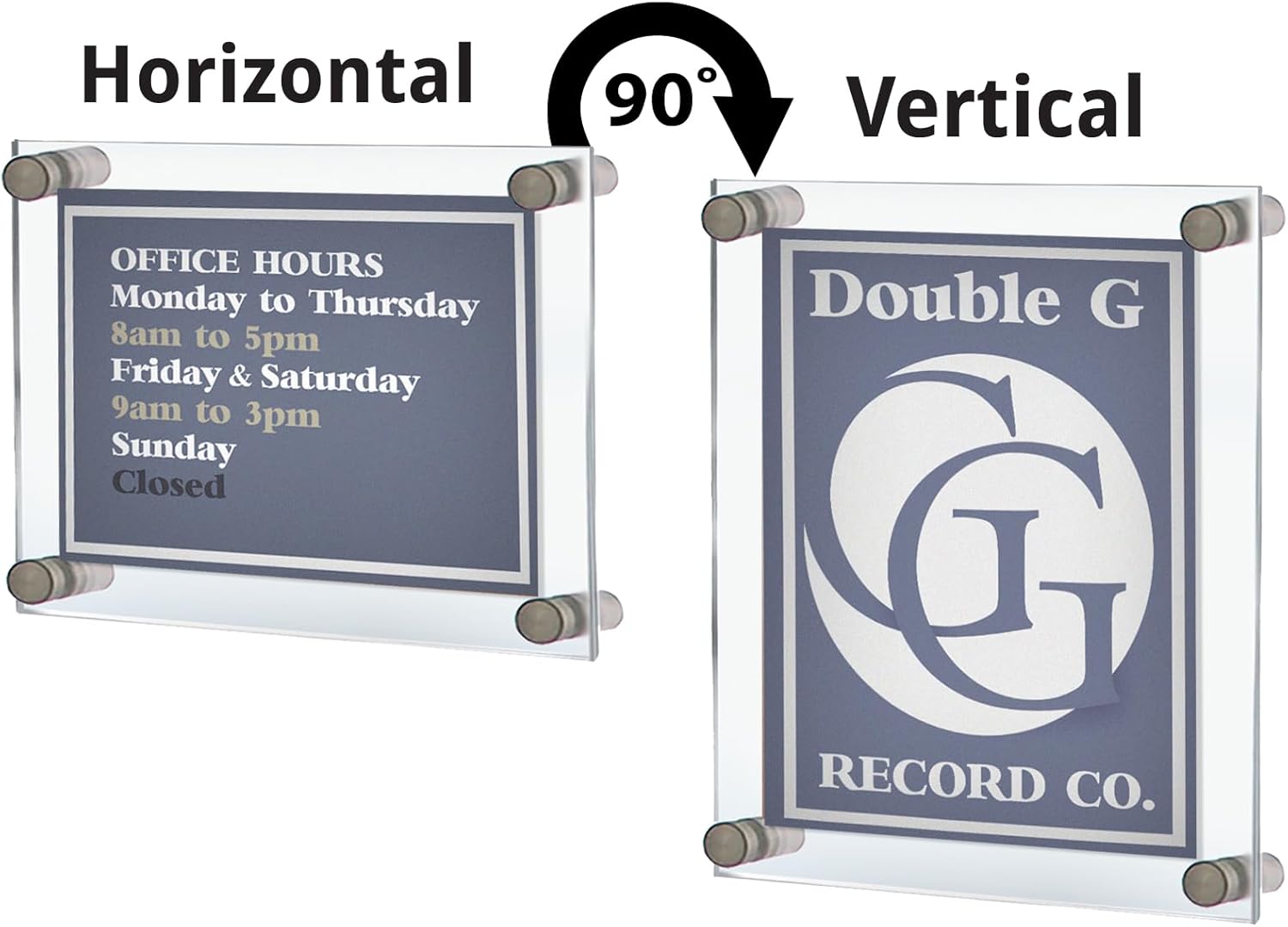 - Graphic Size: 8.5"Wx5.5"H Clear Acrylic Sign Holder with 1" Aluminum Stand-Offs