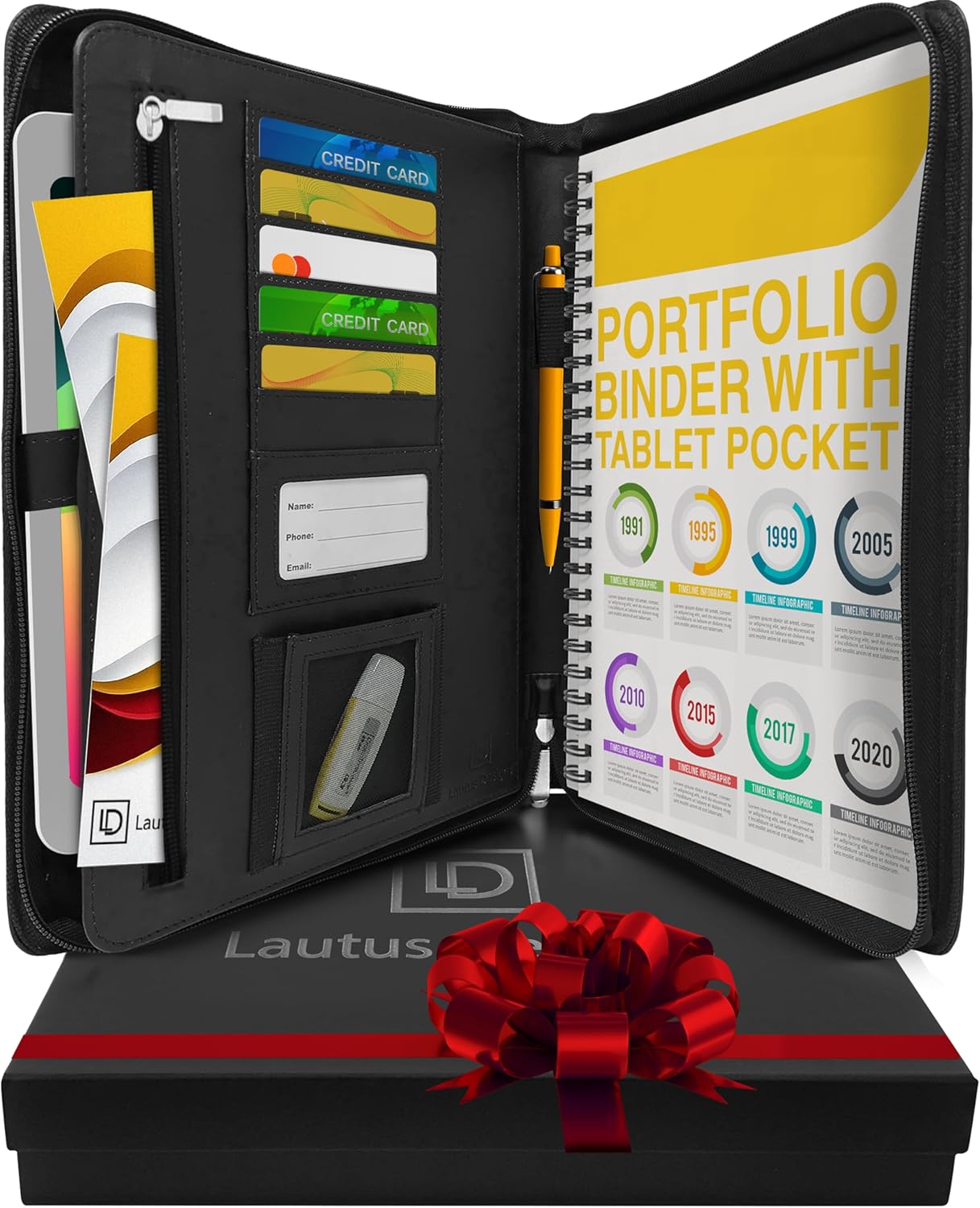 Black Zippered Leather Portfolio Binder - PU Leather Business Portfolio Organizer - Padfolio for Men & Women with US Letter Notepad, 10.5 Inch Tablet Pocket & Gift Box by Lautus Designs