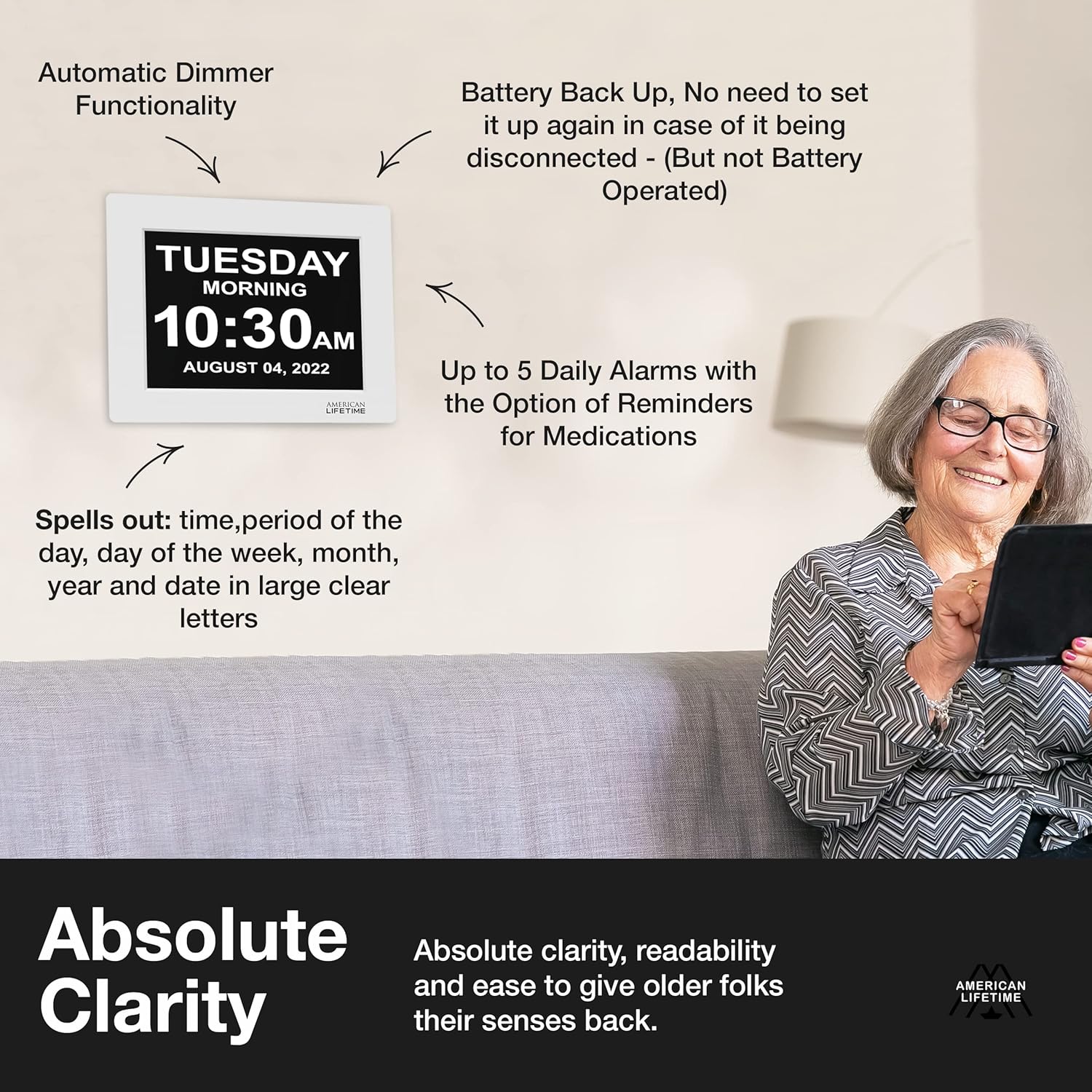 American Lifetime New 2025 Dementia Clock Large for Seniors, Digital Clock Large Display with Custom Alarms, Clock with Day & Date for Elderly, Number Digital Clock 12 Inches White
