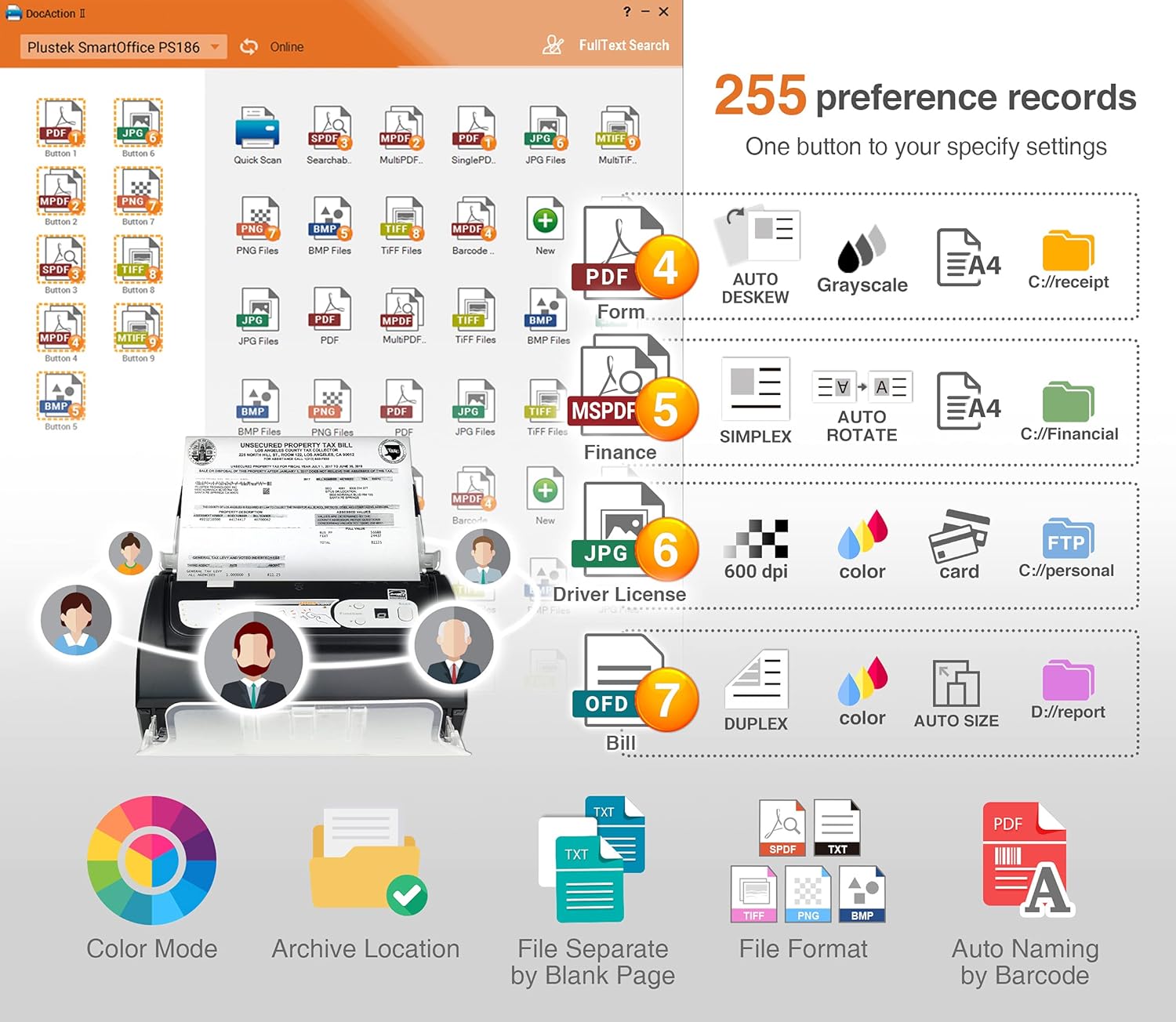 - Intelligent color and image adjustments — Auto Rotate, Crop, Deskew and blank page remove with Plustek Image Processing Technology
