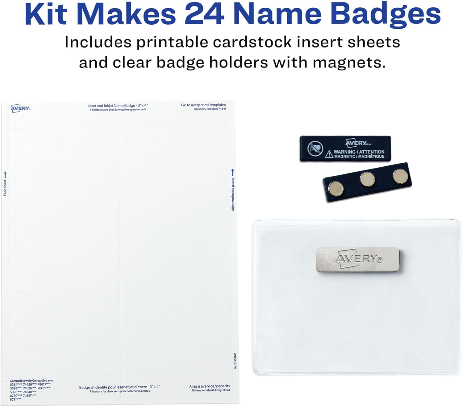 Avery Customizable Name Badges, Magnet Style, 3" x 4", Clear Name Tag Holders, White Laser/Inkjet Printable Inserts, 24 Total (8780)