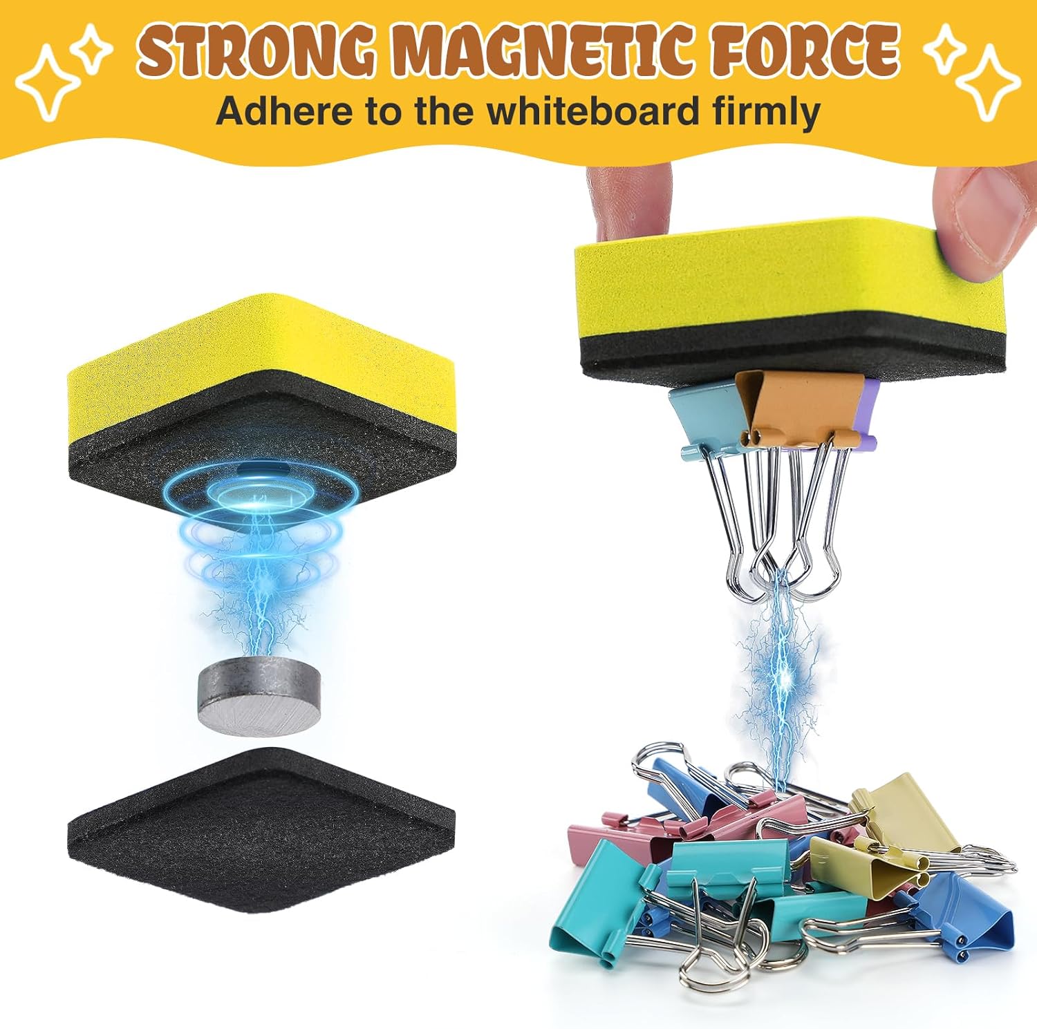 - Strong Magnetic Force: These dry erasers contain strong magnets, which have a strong adsorption force and can always be attached to the whiteboard without falling off, providing more convenience for use in classrooms, offices, conference rooms, and other places.