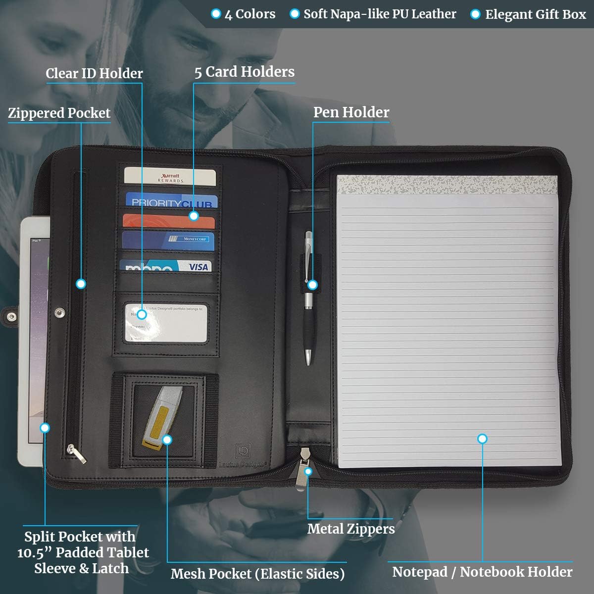 Matt Black Zippered Portfolio Binder - PU Leather Business Portfolio Organizer - Padfolio for Men & Women with US Letter Notepad, 10.5 Inch Tablet Pocket & Gift Box by Lautus Designs