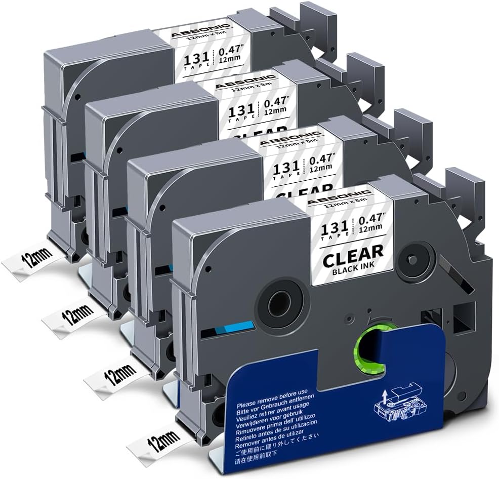 Absonic Tz131 Label Maker Clear Tape Compatible for Brother Tze-131 Tze 12mm 0.47 Laminated 1/2 Tz Label Tape for Brother Ptouch PTD220 PTD210 PTH110 PTH100 PTD400 PTD610BT, Black on Clear, 4-Pack