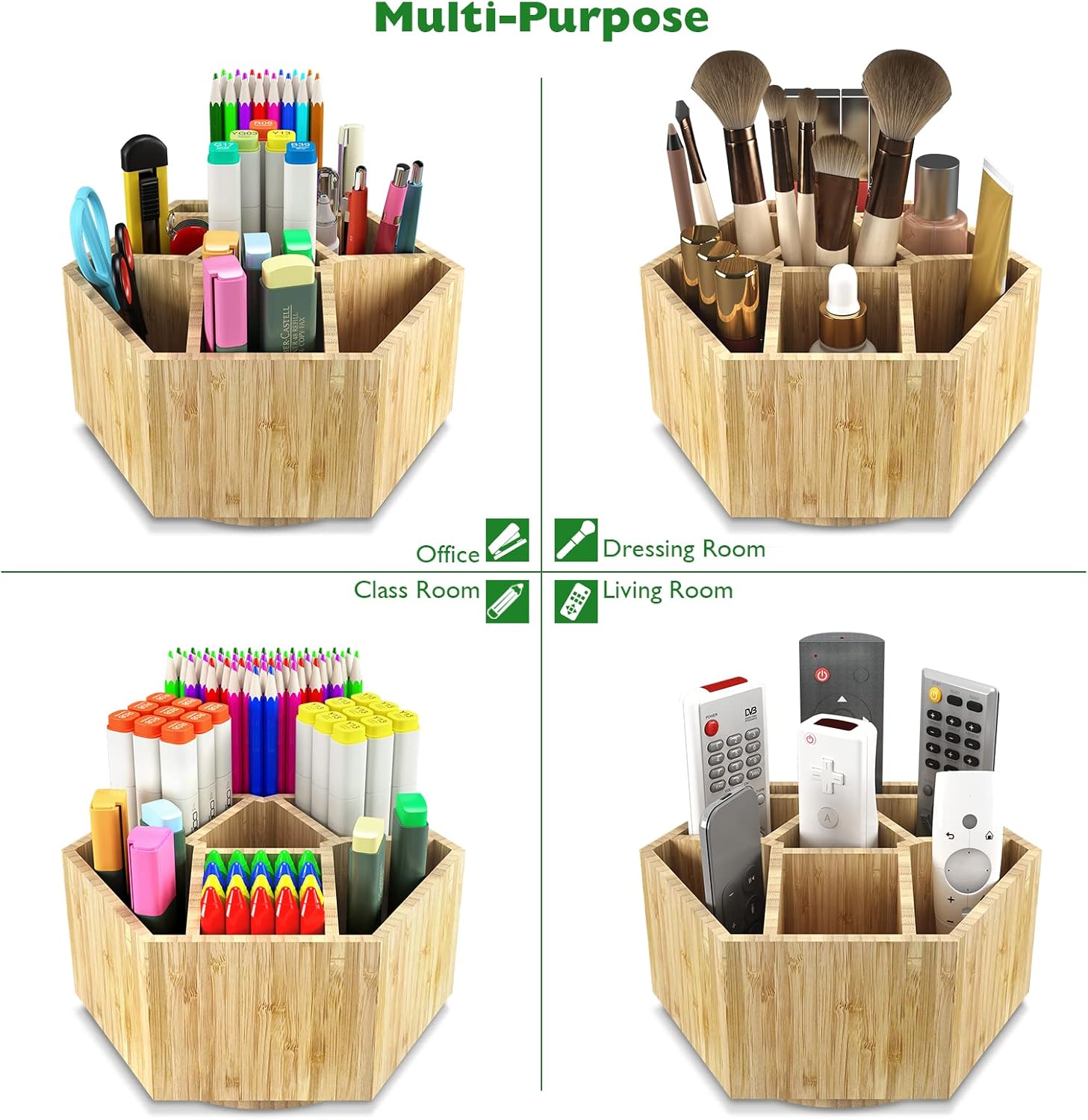 - âăULTRA-LARGE CAPACITYăBack to School Essentials.The bamboo desktop organizer designed as hexagon is to maximize space. On this basis, we divide the whole box into 7 sections, and not all is of a size. For your option, it is designed for various size of items. Except for the 360° revolving design is handy for use, we also trapezoidal design for every section. The special detail design greatly improve convenience.