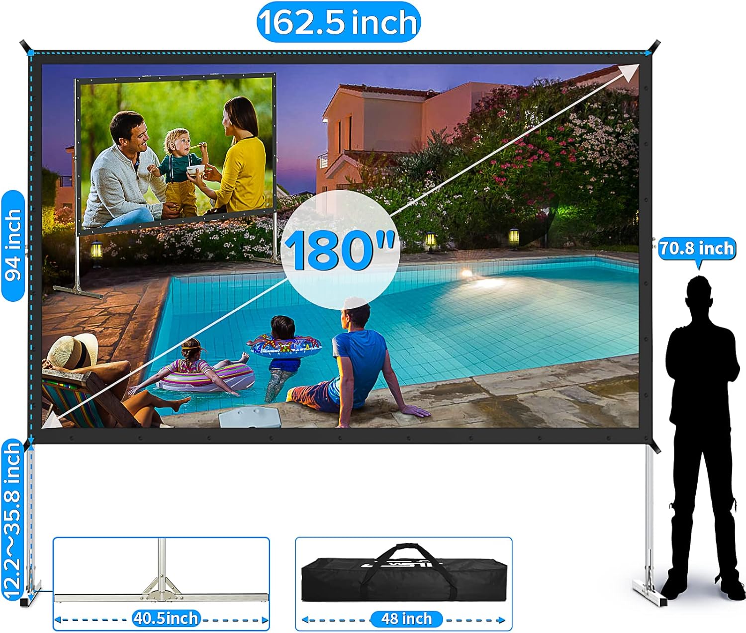 180 inch Projector Screen with Stand,Upgraded 3 Layers PVC 16:9 Large Outdoor Projector Screen,Portable Outdoor Movie Screen with Carrying Bag for Large Commercial Performance
