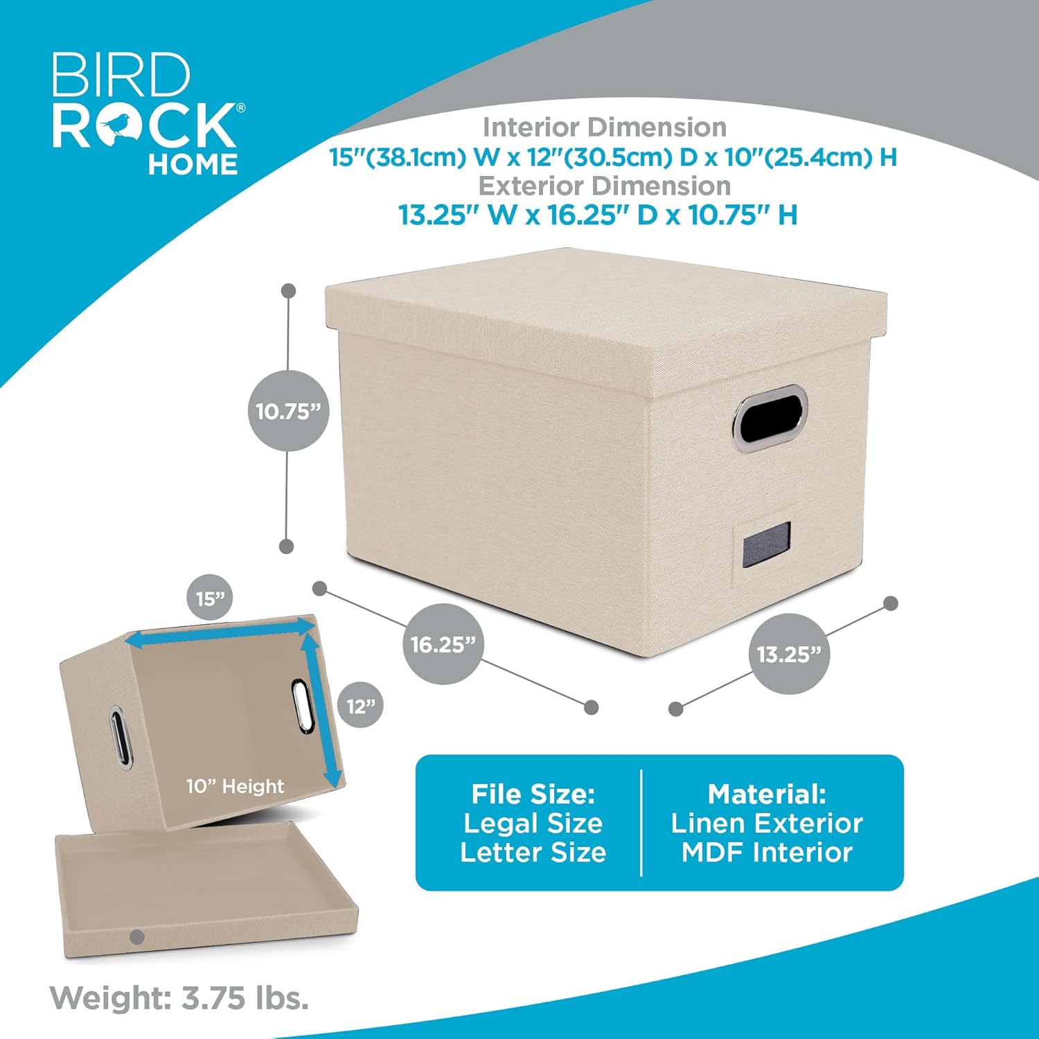 - INCLUDES 1 FILE BOX. DIMENSIONS: Interior Dimensions: 15"(38.1cm) Width x 12"(30.5cm) Depth x 10"(25.4cm) Height; Exterior Dimensions: 16.25" Width x 13.25" Depth x 10.75" Height
