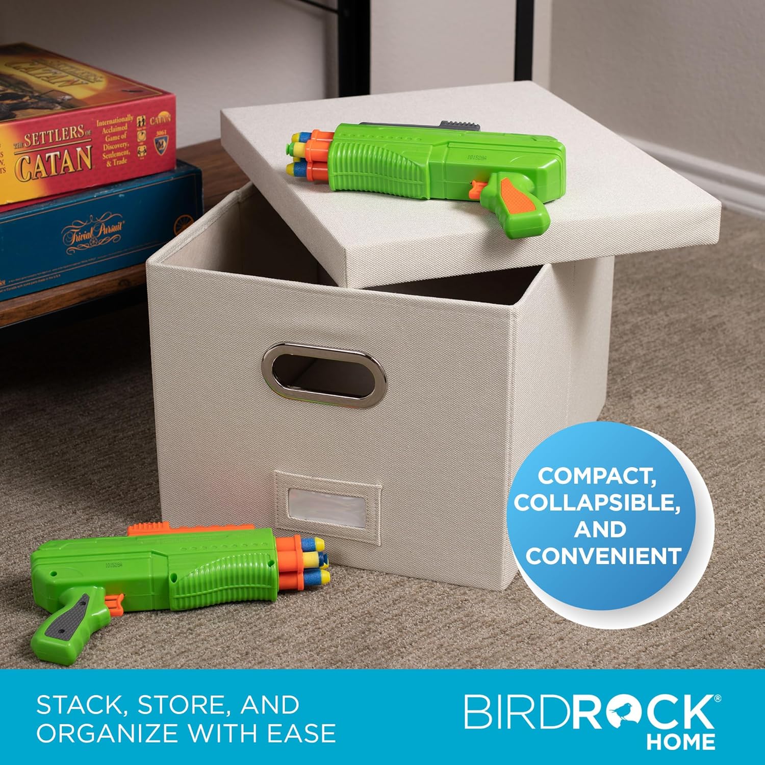- PORTABLE - STACKABLE - VERSATILE: The collapsible storage file bin is equipped with easy access carrying handles and is extremely durable for stacking multiple filing boxes on top of one another. Equipped with a label window for simple organization and may be used for storing toys, closet accessories and other items outside of files.