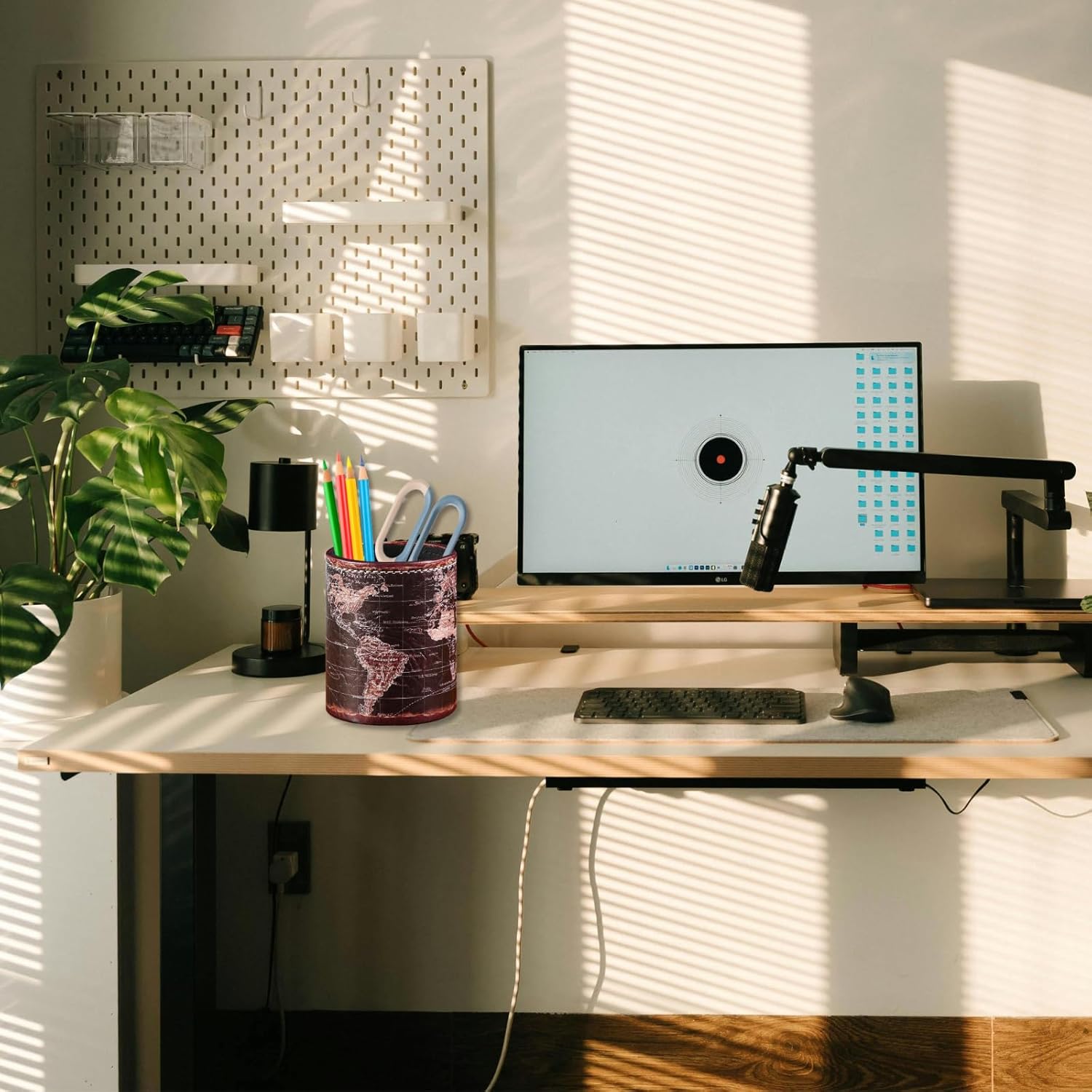 Black World Map Pencil Holder for Desk, PU leather Pencil Cup, Globe Pen Holder for Desk Office Supply Organizer PH46