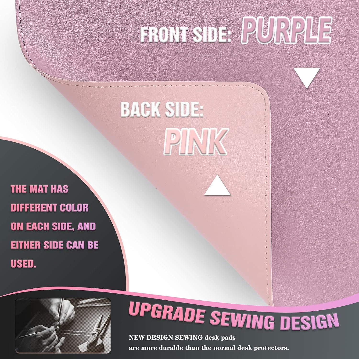 - DOUBLE-SIDED USE: We designed the desk pad with the same material but with different colors on each side, and you can use both sides. Come with a strap to roll up the pad and you can easily take it to anywhere. And also easy to store.