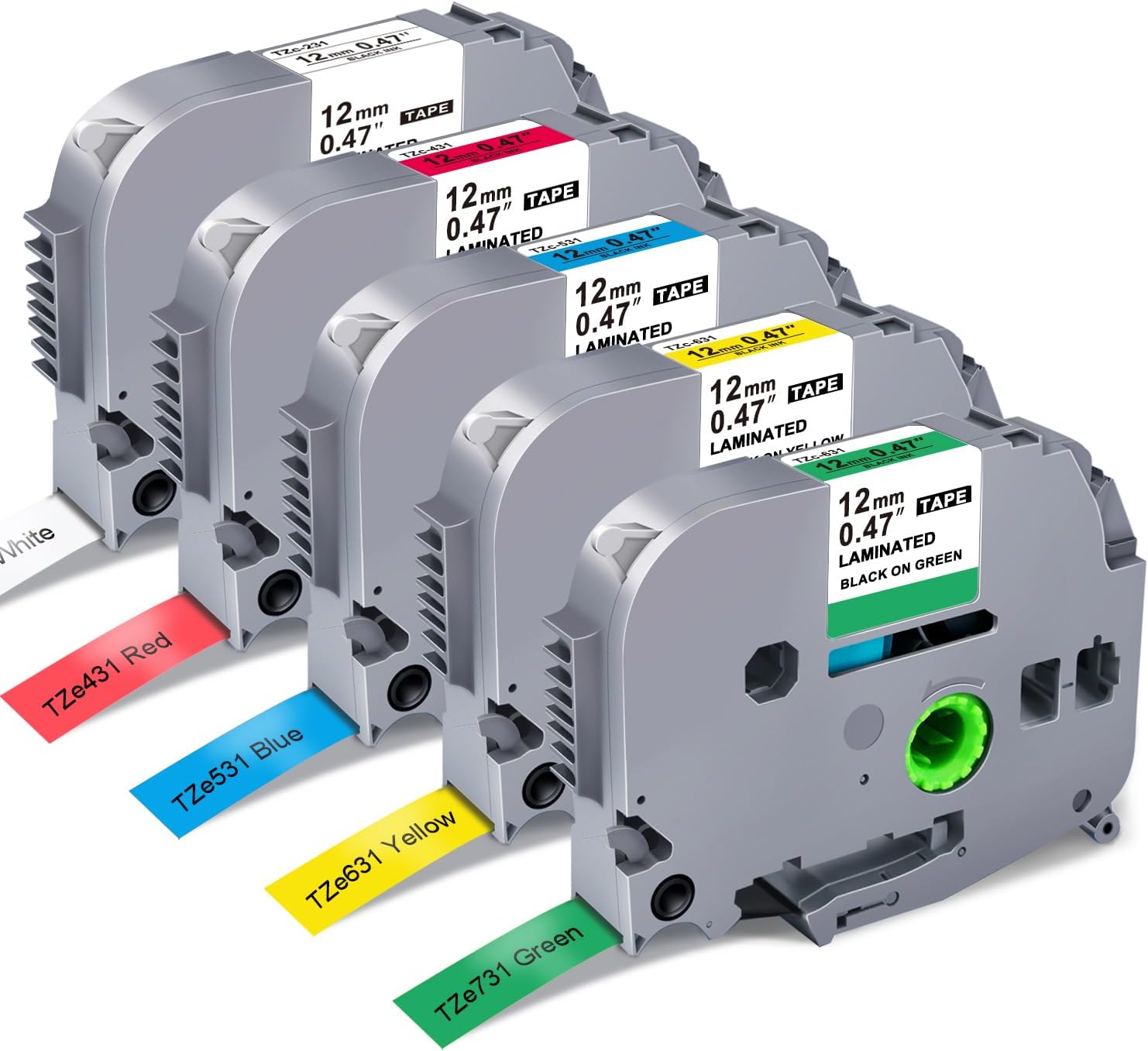 - Package Contents: 5-Pack Replacement for P-Touch Label Maker Tape; Color: TZe-231 (Black on White), TZe-431 (Black on Red), TZe-531 (Black on Blue), TZe-631 (Black on Yellow), TZe-731 (Black on Green); Basic infos for size: Width: 1/2"(12mm 0.47 inch), Length: 26.2 Feet (8 meter) per TZe TZc TZ label tape (Not original)