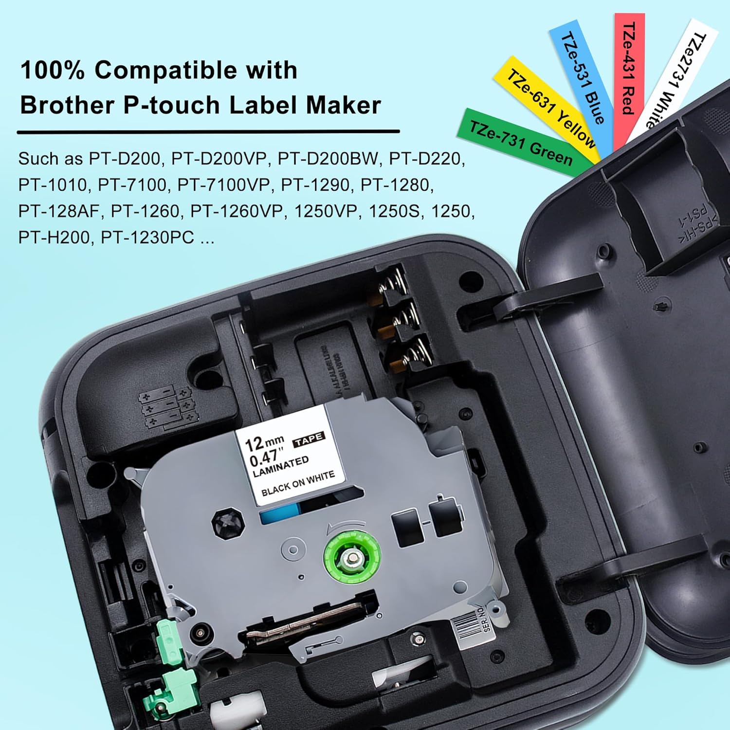 - Perfect Compatibily: Compatible with Brother P Touch Label Makers that work with TZe Label Tapes 12mm, such as PT-D220, PTD210, PTH100, PTD400AD, PTP700, PTP750W, PTD600, PT-Cube Smartphone Label Maker (White) / (Blue), PT-E550W, PTE500, PT-Cube Plus PT-P710BT, PT1230PC, PT1890C, PTD600VP, PT2730VP, PTD450, PTD400, PTD200, PT1880C, PT1880, PTH500LI, PT2730, PT1890w, PT2430PC Label Printer and more