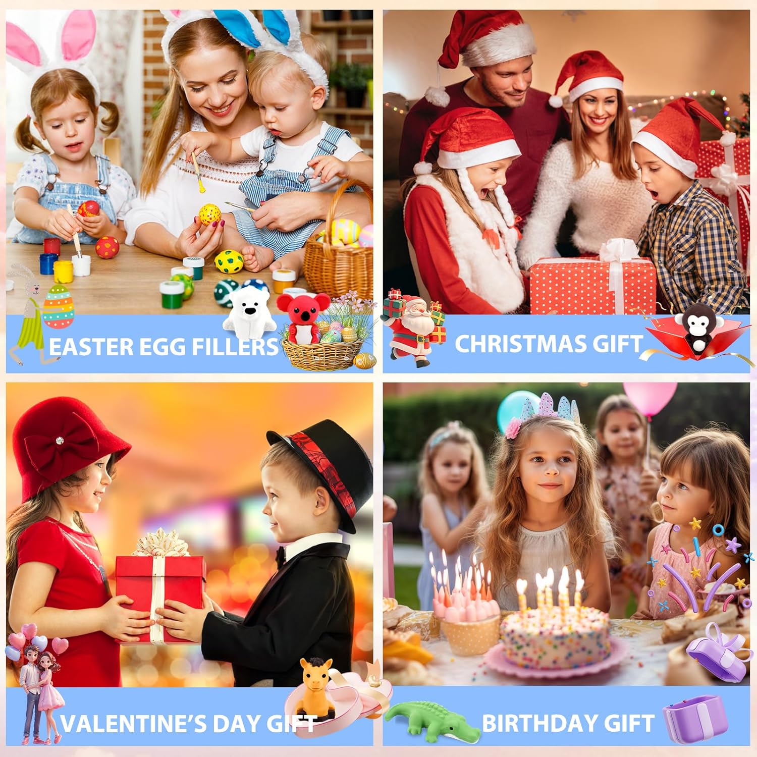- PARTY PERFECT:From Easter basket stuffers to Christmas stocking stuffers, these food erasers for kids (check out our snack-shaped sets!) and animal designs work for any theme. Hosting a woodland party? Mix the cute party favors with glittery decoration! Their collectible size makes them ideal for goody bags, treasure boxes, or carnival prize packs. Parents rave about their durability – no more broken small erasers for kids after one use