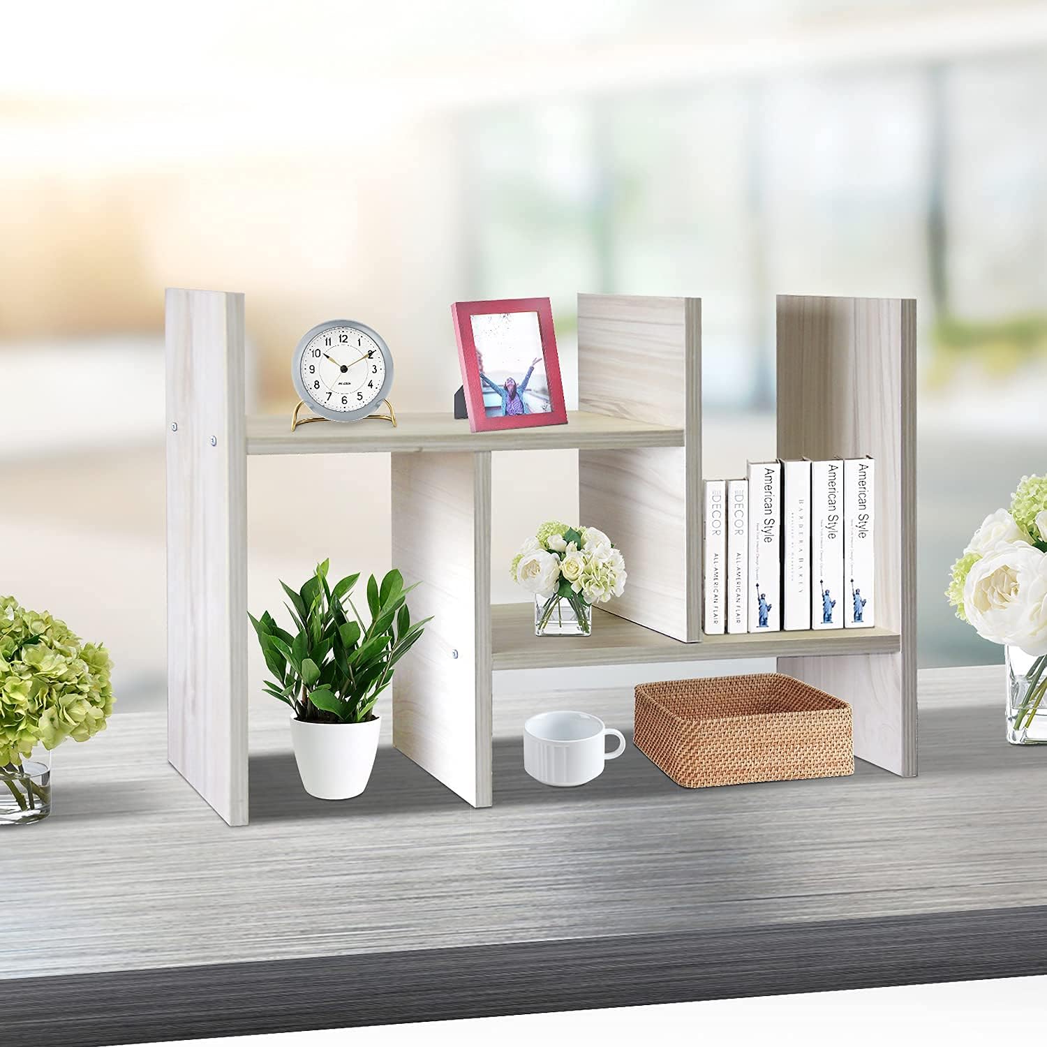 J.M.Deco Desktop Organizers and Storage for Office, Adjustable Desk Organizer Shelf Double H Display, True Natural Stand Shelf, Desktop Organizer White Wood Tone