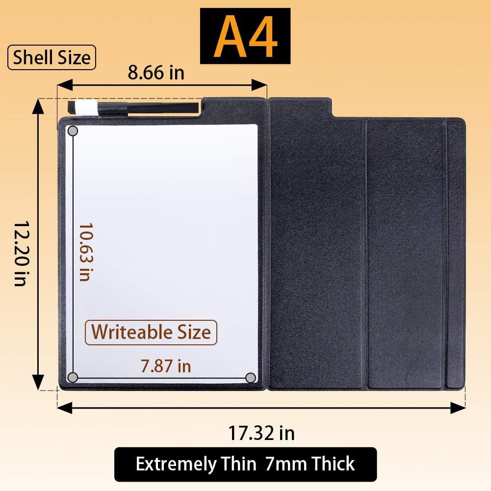 - đăPORTABLE AND MOBILEă PU cover, overall size is about 9"*12", the inner whiteboard is A4 size. The whole thickness is only 0.28", excellent space saving product, you can put it in your file box or easily bring it everywhere.