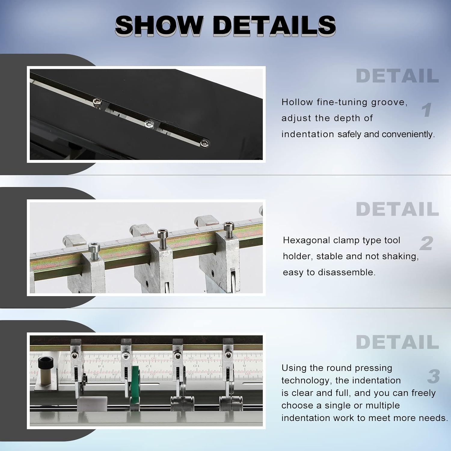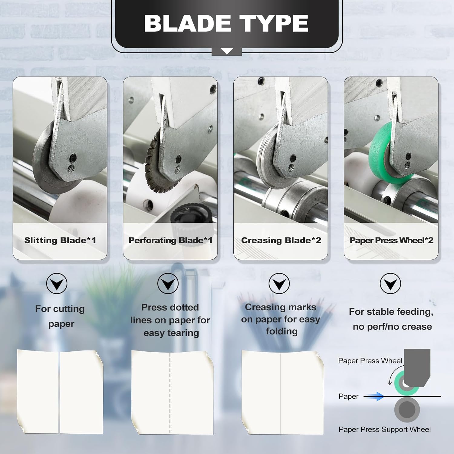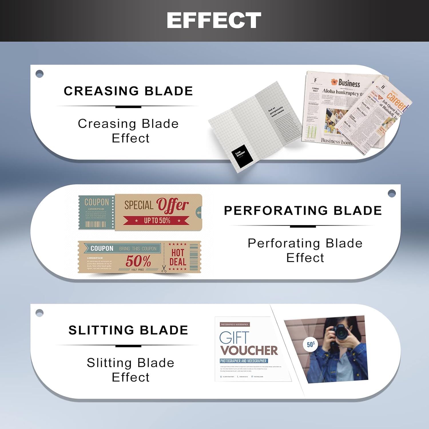 - Versatile Blade Options - Equipped with 3 specialized blades to cater to diverse needs: a creasing blade with adjustable width options (1.0/1.2/1.5mm), a perforation blade for creating dotted lines, and a cutting blade for precise paper trimming (not ideal for thick paper). Easily handle paper thickness from 60-500 gsm, making it perfect for various projects.