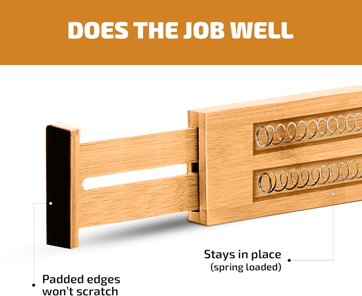 - STURDY BAMBOO: The bamboo drawer organizer looks gorgeous in your drawer. It’ll actually look like your drawer was custom made. The bamboo kitchen drawer dividers are sturdy and will hold up well with use.