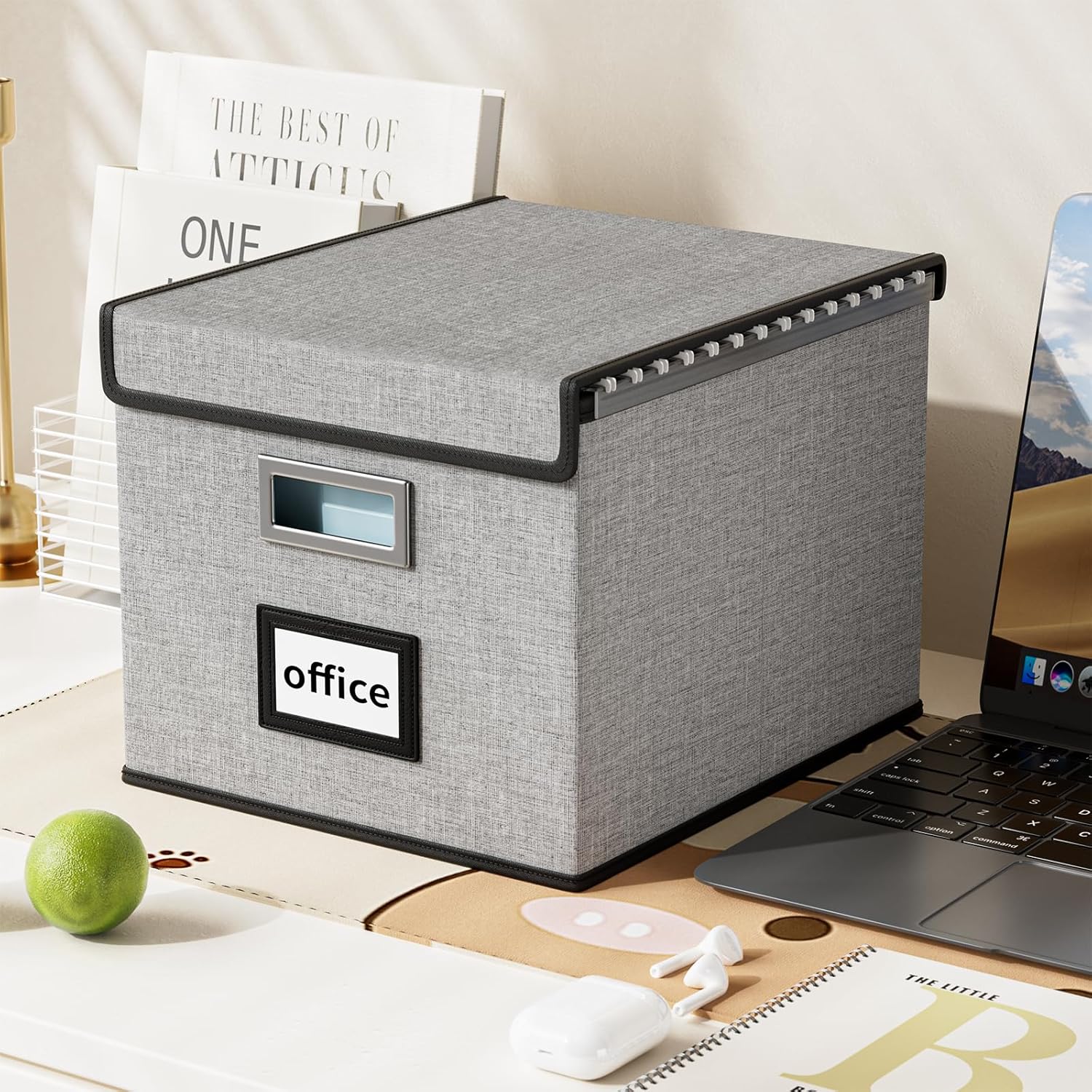 Huolewa Upgraded Portable File Organizer Box with Lid, Collapsible Linen Hanging Filing Storage Boxes with Plastic Slides, Decorative Home/Office Filing System Box for File and Folders Storage (Gray)