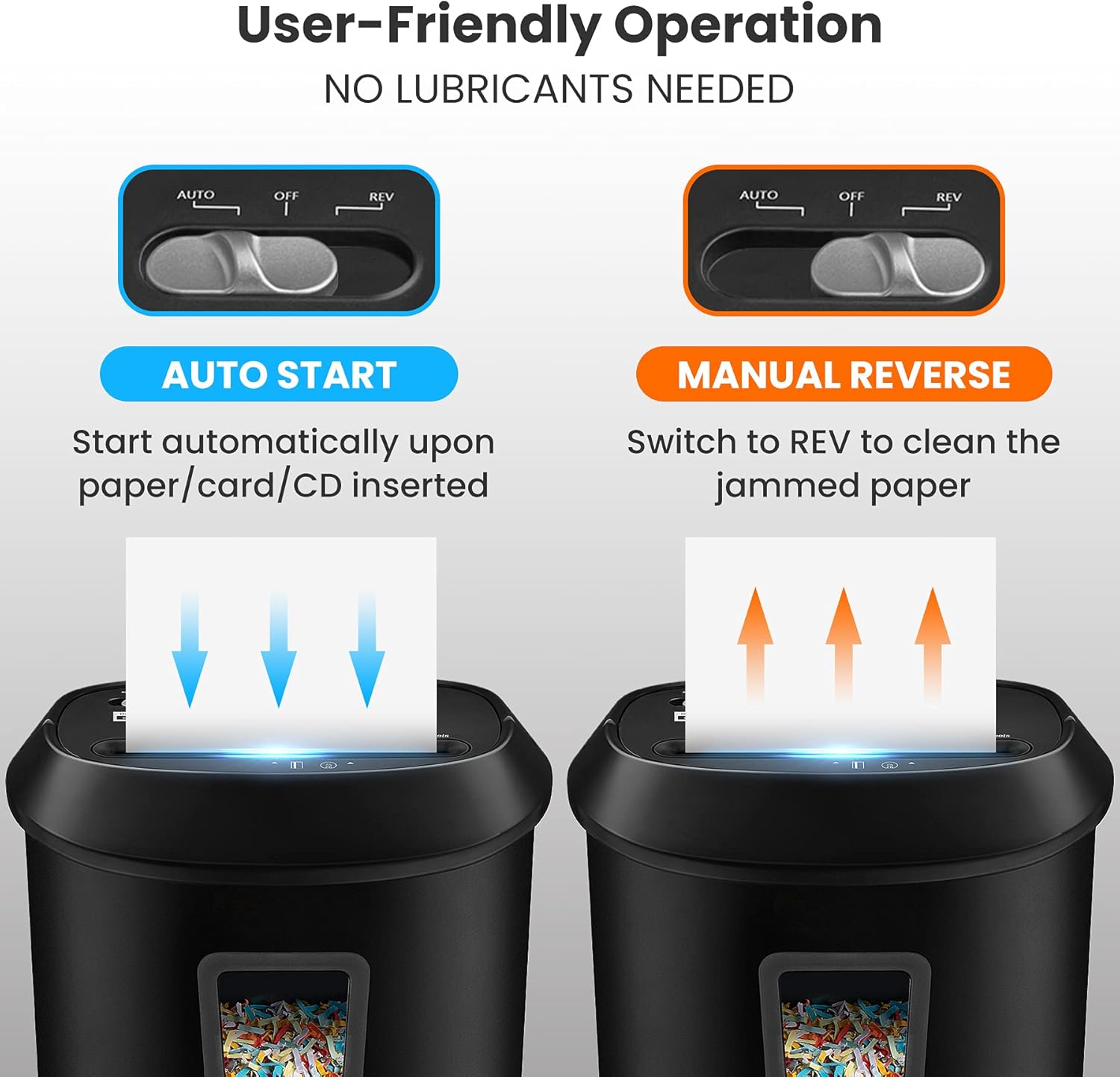- Convenient Design: The shredder has 3-mode control switches (Auto, Off, Rev); Auto start, stop and manual rev functions simplify shredding and paper jam clearing processes, release you from the frustration of jamming. It has one year protection with ETL certification