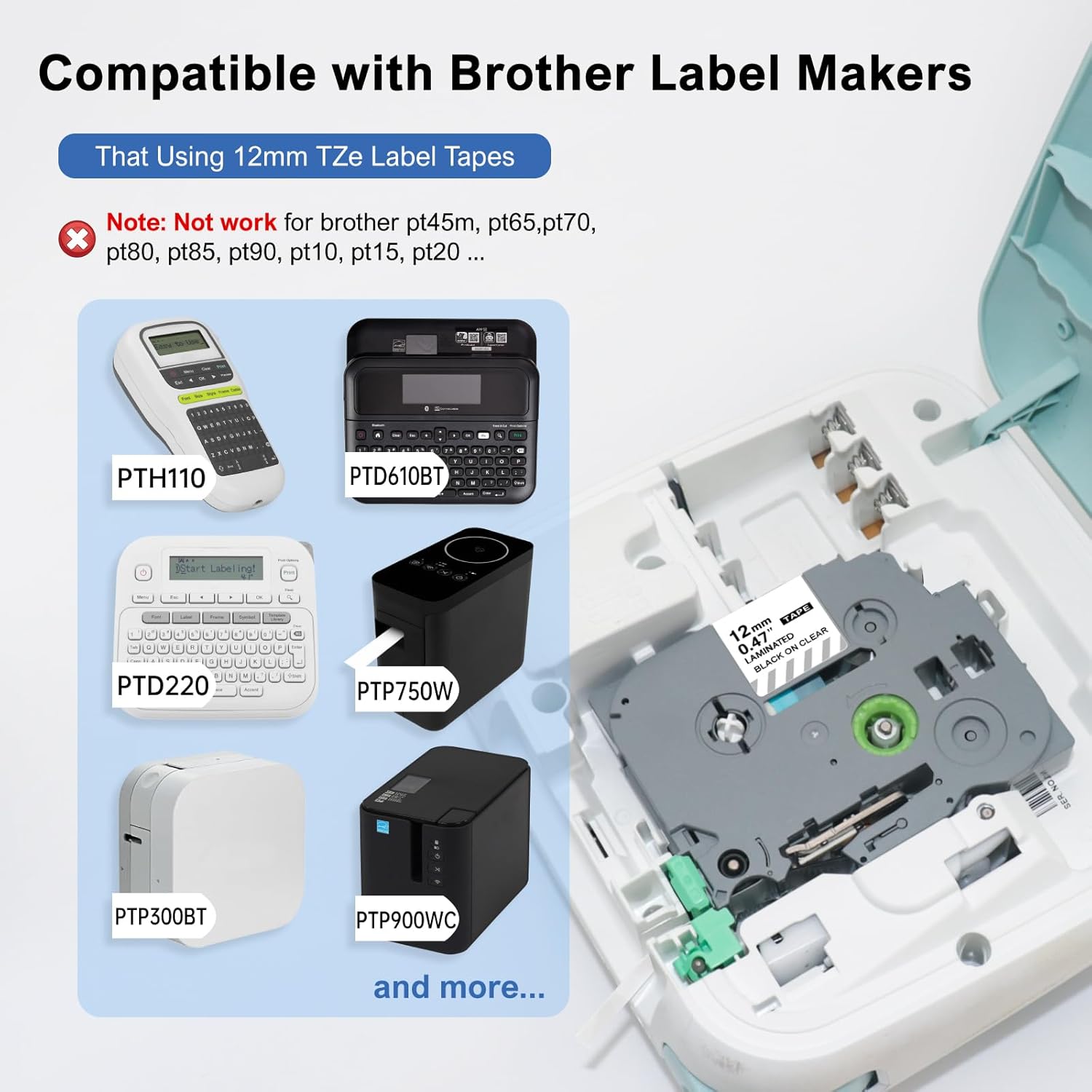 - PTD210 Label Tape Clear Compatible with Brother Label Maker Machines Using 12mm Tze Label Tape: Ptouch PT-D210, PT-D200, PT-H110, PT-H100, PT-D220, PT-D400, PT-D410, PT-D400AD, PT-1280, PT-1290, PT-1880, PT-E500, PT-D450, PT-D600, PT-P750W, PT-D800W, PT-1090, PT-1180, PT-1190, PT-1290, PT-1230PC, PT-1890W, PT-1900, PT-2030, PT-2040, PT-P300BT, PT-P700, PT-P710BT, PT-H300... P touch label tape clear TZe131 is NOT work for brother pt45m, pt65, pt70, pt80, pt85, pt90, ptm95, pt10, pt15, pt20, pt150
