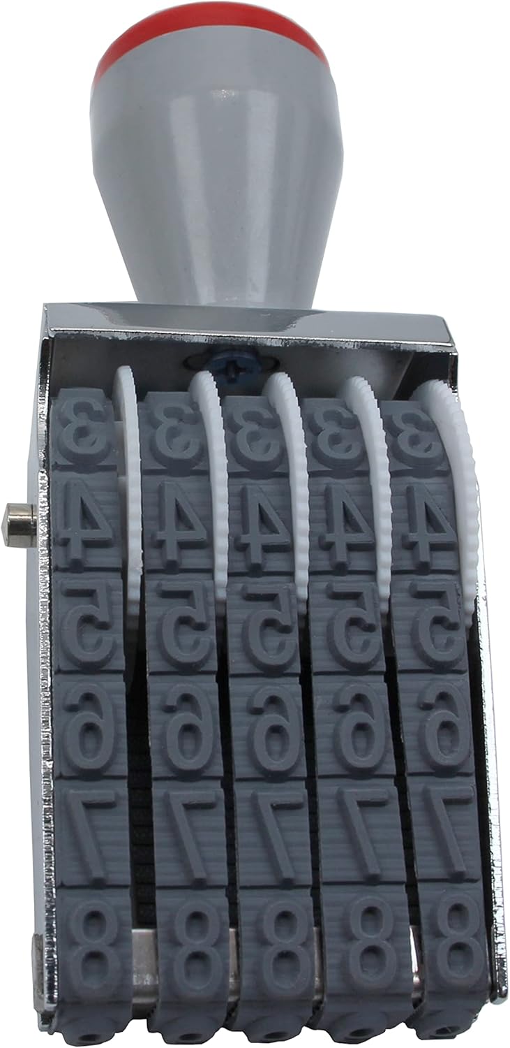 - Traditional 5 digit Number Stamps, Material : Metal, Rubber, Plastic; Size:Length 100 mm/3.93 in,Width:37 mm/1.43in,High:25 mm/0.98 in; Character : Width 5 mm /0.19in,Height 7 mm/0.27 in; Color : Gray black; Weight: 60 g; Package Content : 1 X Numbering Stamp Without ink,Requires a separate ink pad.