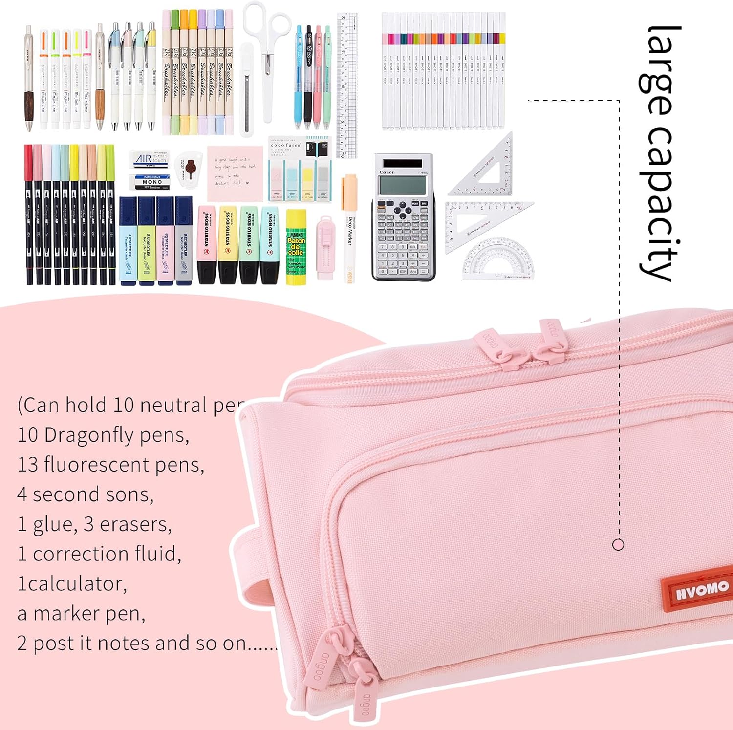 - 【big Capacity】 The main compartment fit up to 80-100 pens/pencils, and can store small stationery in the side pockets, such as notes, Rubber, Sticker, etc. In the slot of front flap , can put a few shorter pens that are often used.