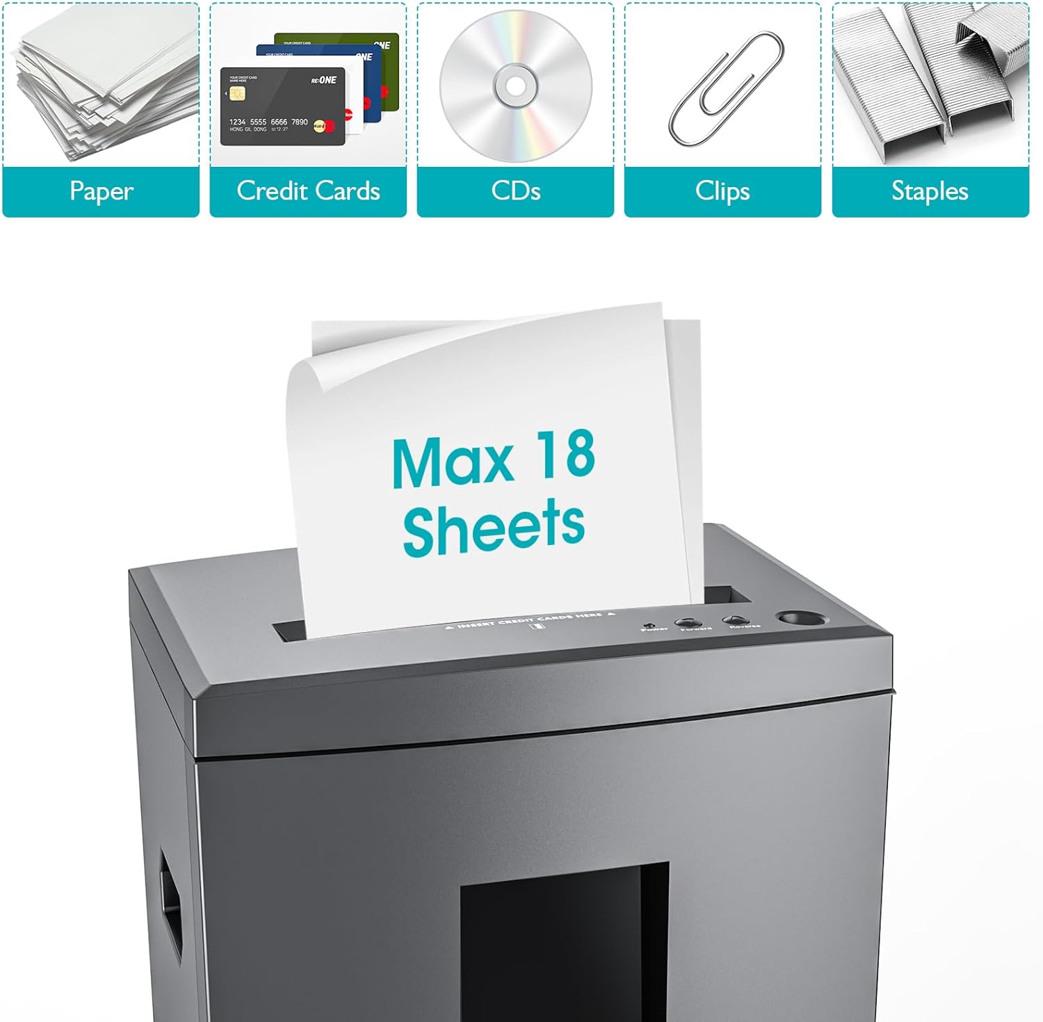 - 【Secure Cross-Cut Shredding】Cross-cut security level P-4 to secure confidential information. Shreds max 18-sheet paper/staples/clips into particles measuring 5/32" x 1-3/8" (4mm x 35mm); also shreds CD and Credit Card. The blades will cut each disc into three pieces. This crosscut paper shredder is ideal for any home office or commercial setting.