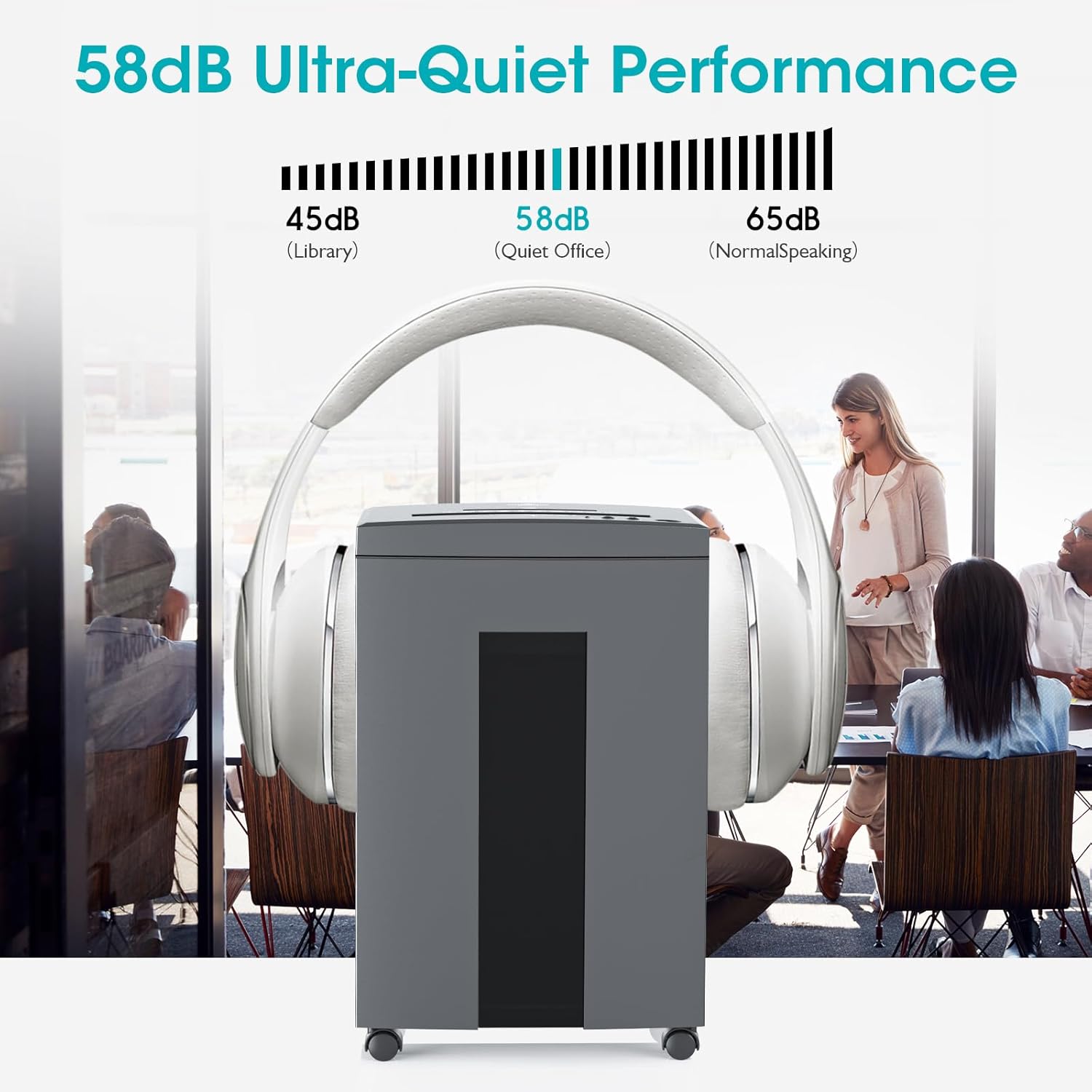 - 【Ultra-Quiet Performance】Low noise level 58dB ultra-quiet performance; 6 gallons pull-out waste bin with large easy viewing transparent window. Perfect for a home paper shredder or a quiet paper shredder for office environments.