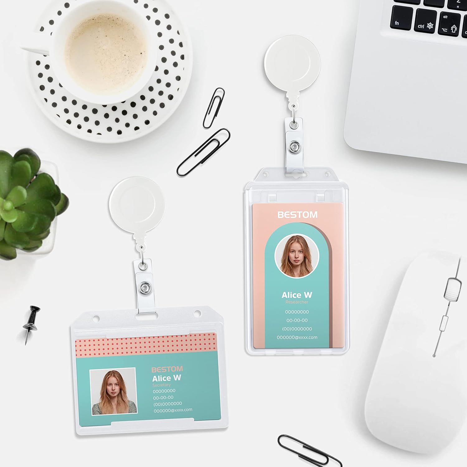 Badge Reels Retractable Badge Holder with Clip, Id Clips for Badges, Id Badge Reel, Retractable Id Badge Clip with Clear Vinyl Strap & Alligator Swivel, No Twist Dispenser (White)