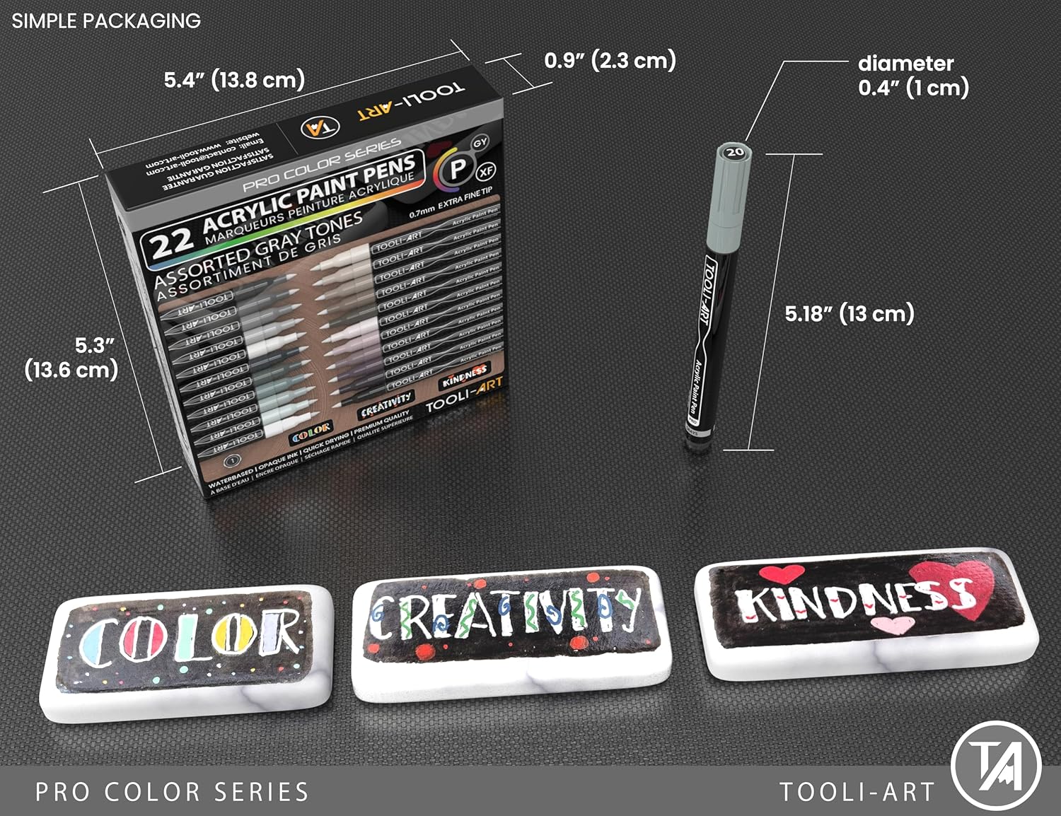 Acrylic Paint Pens 22 Gray Tones Assorted Pro Color Series Markers Set 0.7mm Extra Fine Tip for Rock Painting, Glass, Mugs, Wood, Metal, Canvas, Projects, Non Toxic, Waterbased, Quick Drying