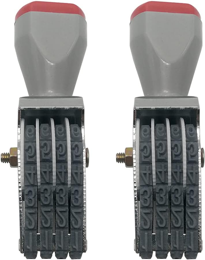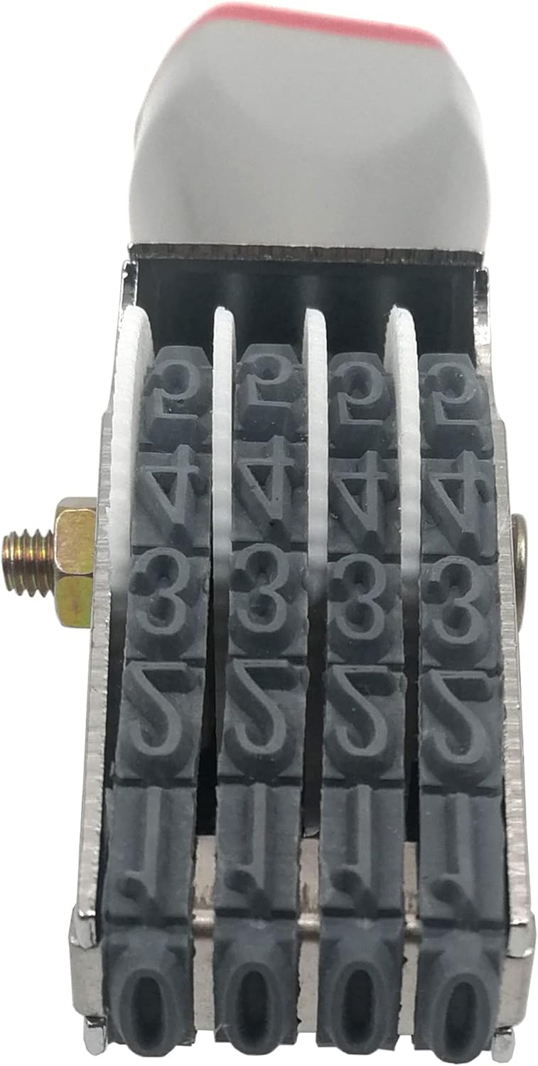 - 4 Digit Rotating Number Stamp Traditional 4 digit rubber stamps, Material : Metal, Rubber, Plastic; Size:Length :90 mm/3.54 in, Width:20 mm/0.78 in,High:25 mm/0.98 in, Character : Width:4 mm /0.15 in,Height:7 mm/0.27 in, Color : Gray black; Weight: 45 g, Package Content : 1 X Numbering Stamp (Without ink,Requires a separate ink pad)