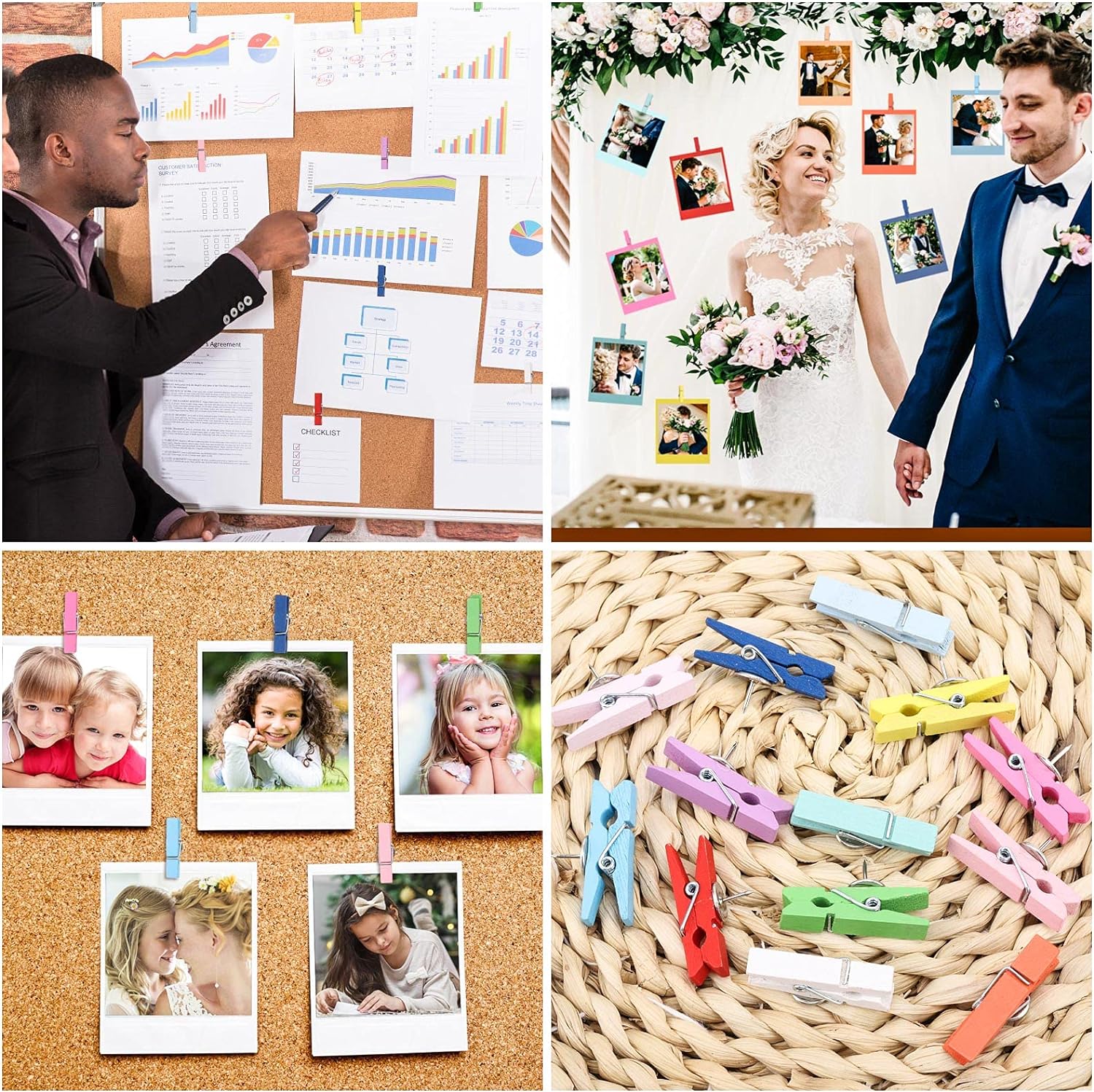 - Wooden clips combine the advantages of clips and pins to enable damage-free display of photos, pictures and notes on a corkboard or bulletin board. And you don't have to remove and insert them from the corkboard as often