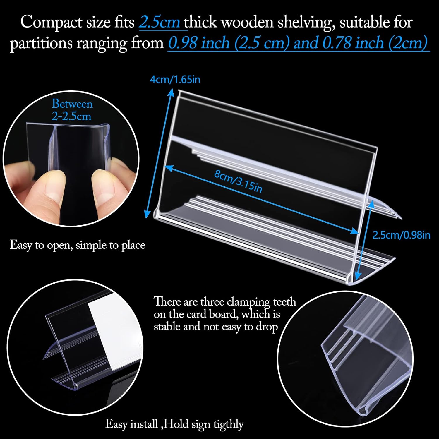 - Wide applications: Lable holder clip on wooden shelving are widely used on retail store,snack shops, supermarke and shopping malls. also Suitable for wooden display stand or wooden bookcase at house appliance.