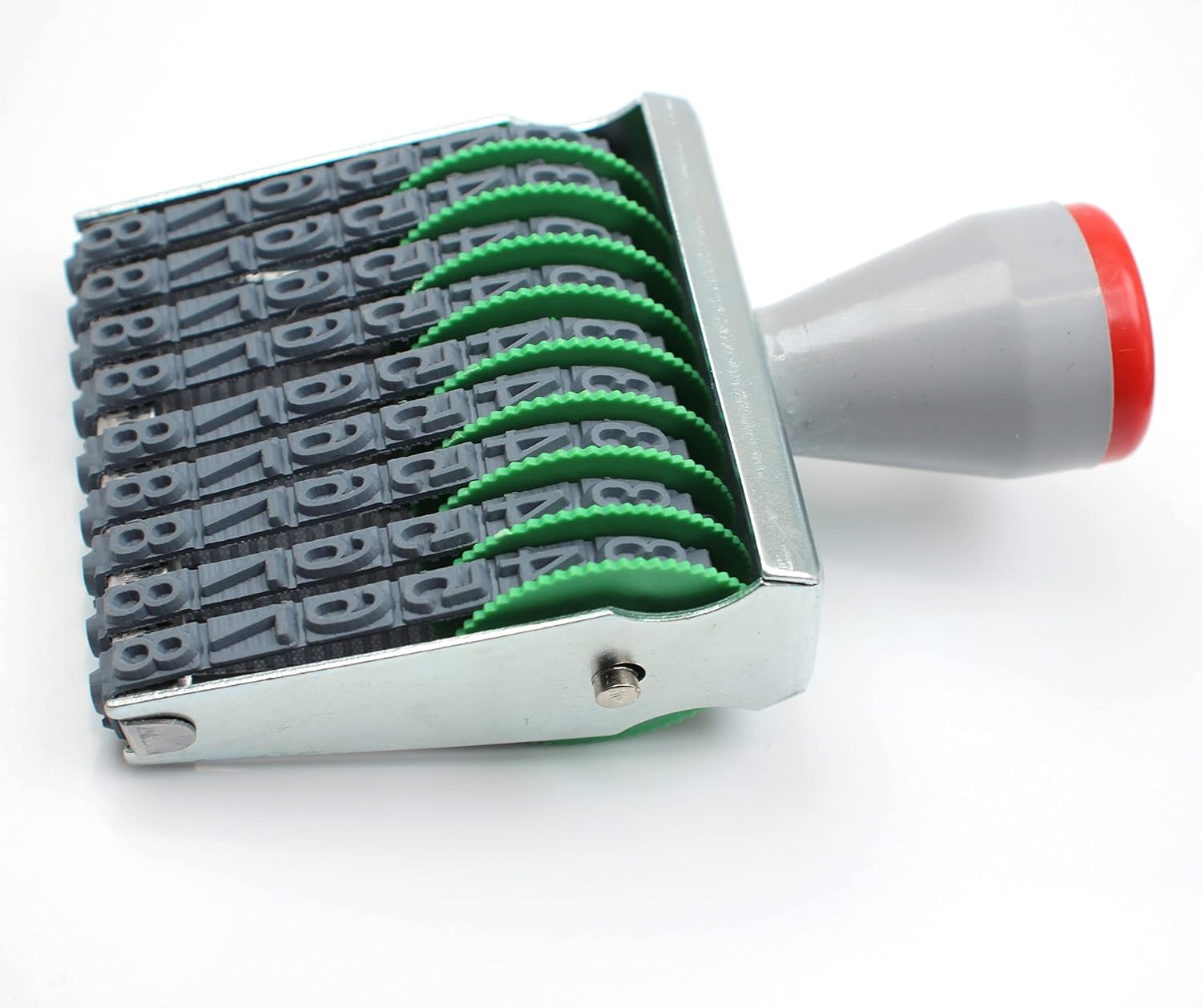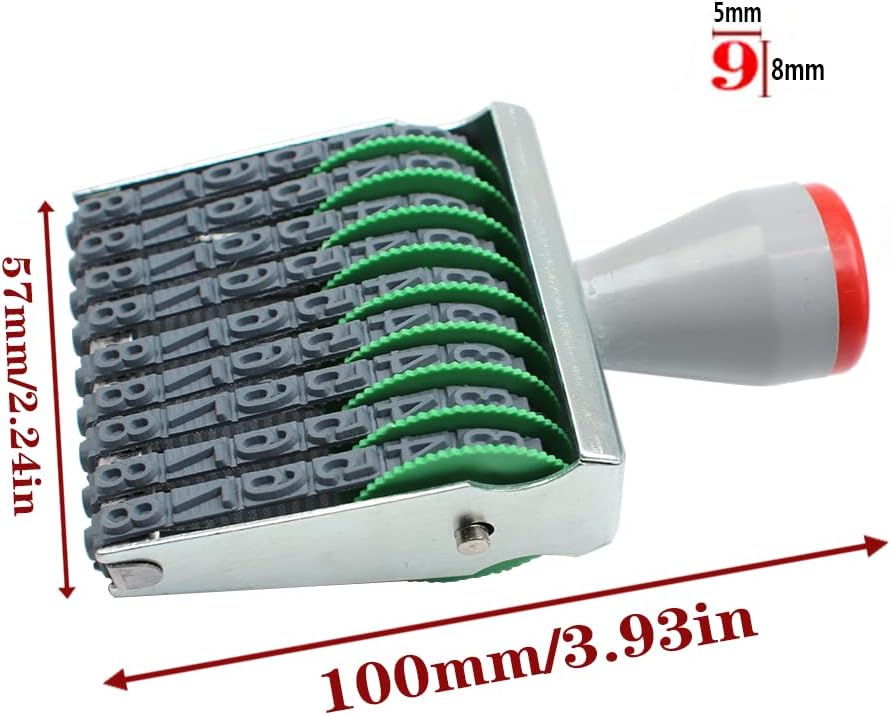 - Rolling stamp,ļ¼ Material : Metal/Plastic. Sizeļ¼Length :100 mm/3.93 in, Width:57 mm/2.24 in,High:25 mm/0.98 in,Character : Width:5 mm /0.19 in,Height:7 mm/0.27 in, Color : Gray black,Weight: 75 g. Package Content : 1 X Numbering Stampļ¼Without ink Requires a separate ink pad).