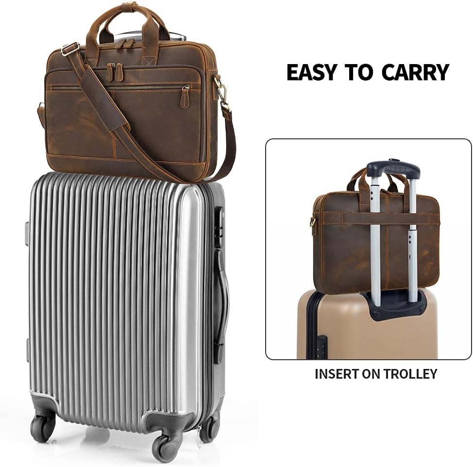 - Comfort and design: Mens briefcase with Detachable adjustable Genuine leather padding shoulder strap inside the bag can easily convert your laptop bag to a single-shoulder mens briefcase or hang briefcase and securely slip over the handle of any rolling luggage,suitcases or trolly case for hands-free transport.