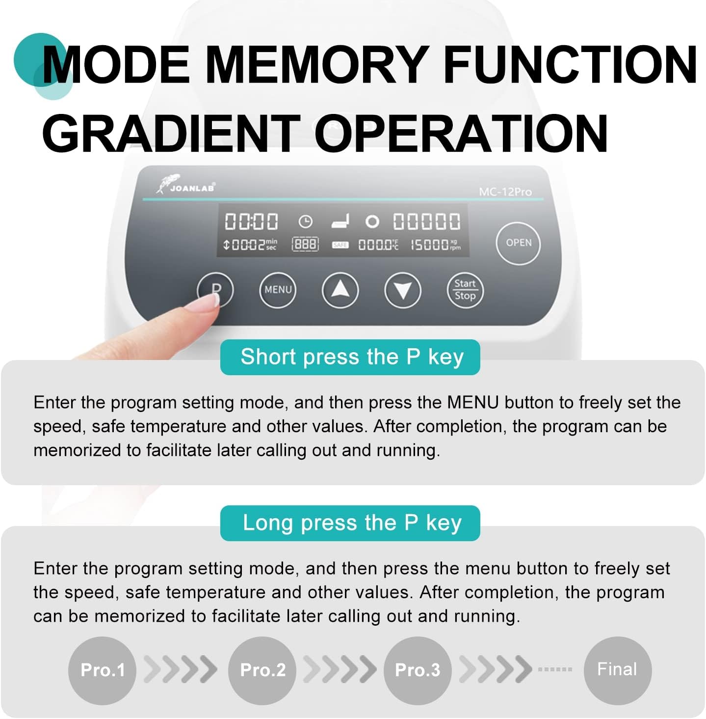 - JOANLAB MC serice is perfect benchtop microcentrifuge for your lab to do quick spin downs .With over temperature protection, when the temperature in the centrifugal chamber is too high during operation, the centrifuge machine will automatically shut down and open the lid, the buzzer will alarm for 5 seconds,and the SAFE flashes. Avoid damage to temperature-sensitive experimental samples due to excessive temperature to meet your diverse experimental needs.