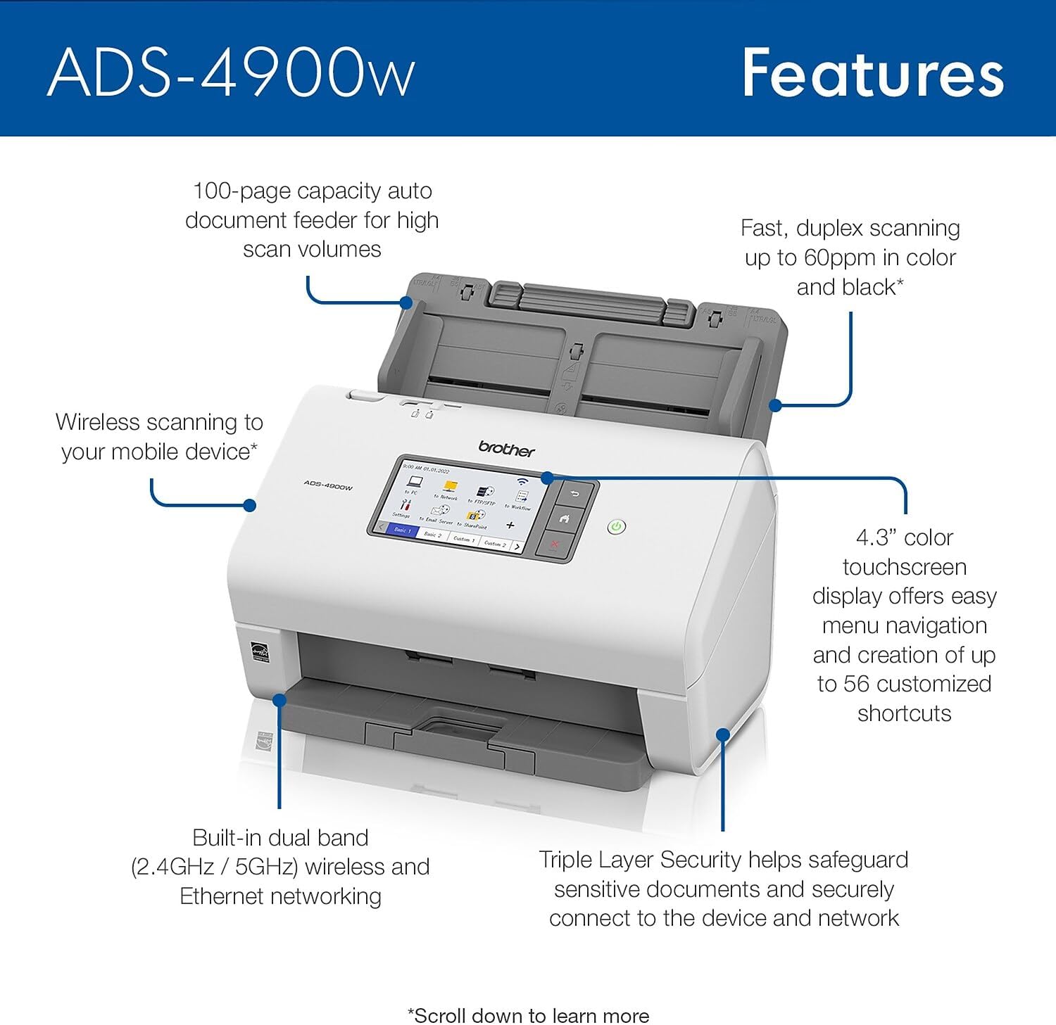 - ROBUST CAPTURE SOLUTION: The Brother ADS-4900W Professional Desktop Scanner is a great choice for busy offices and workgroups, built for the demands of how work now works.