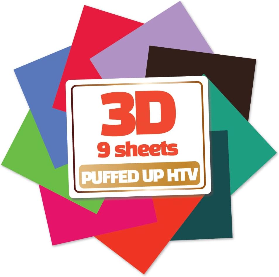 3D Puff Vinyl Heat Transfer 10"x12"-9 Sheets 9 Special Assorted Colors HTV Bundle Iron-On Design for T-Shirt Compatible with Cricut Silhouette Cameo Heat Press Machine Easy to Weed Cut