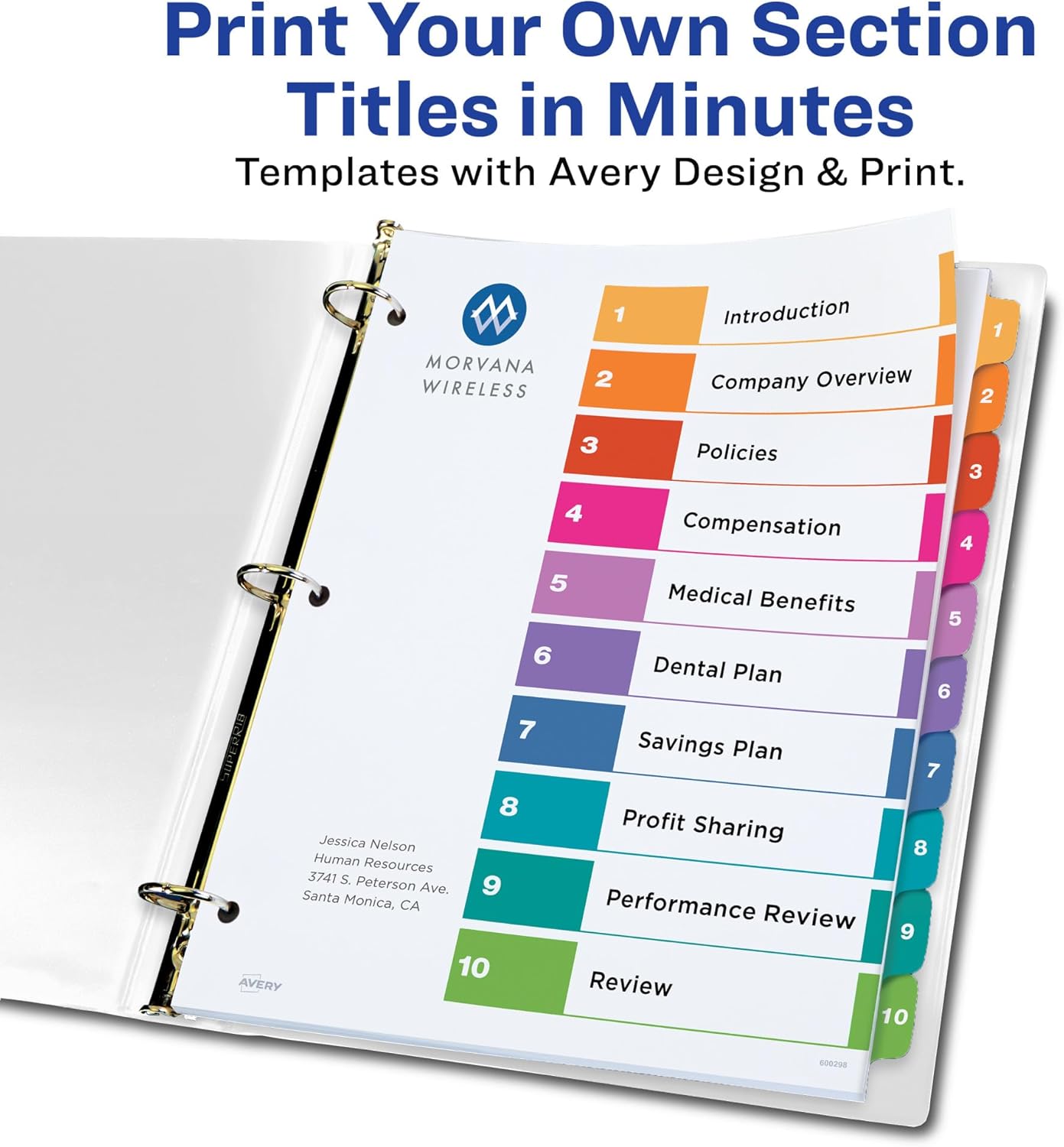 - 10 Tab Dividers feature a customizable table of contents page with easy-to-use Ready Index template, double-sided reinforced holes and tabs and coordinated multicolor tabs for organizing subjects
