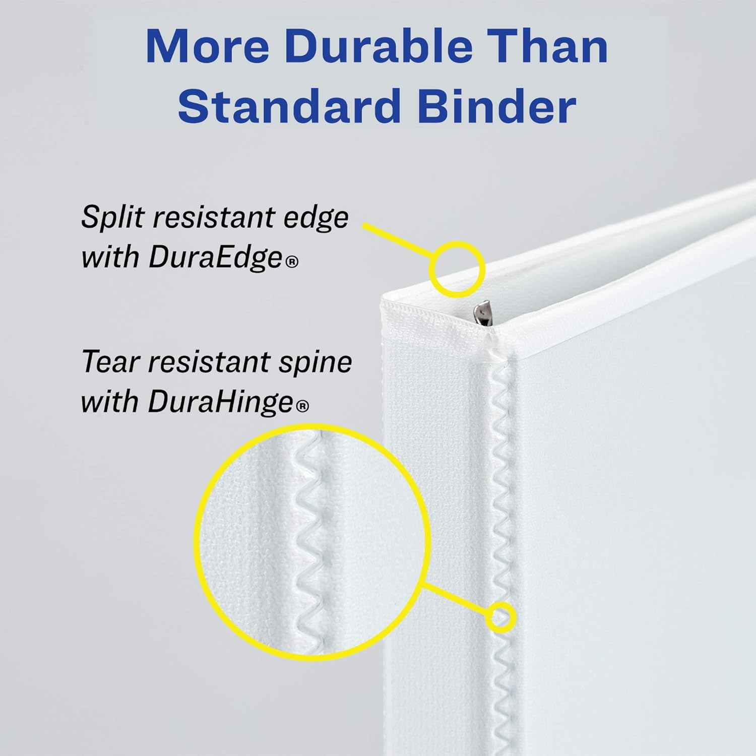 - White heavy-duty binder features 3 inch One Touch EZD rings, 3.5" tear-resistant DuraHinge spine, DuraEdge split-resistant edges, 4 clear interior pockets and customizable covers and spine