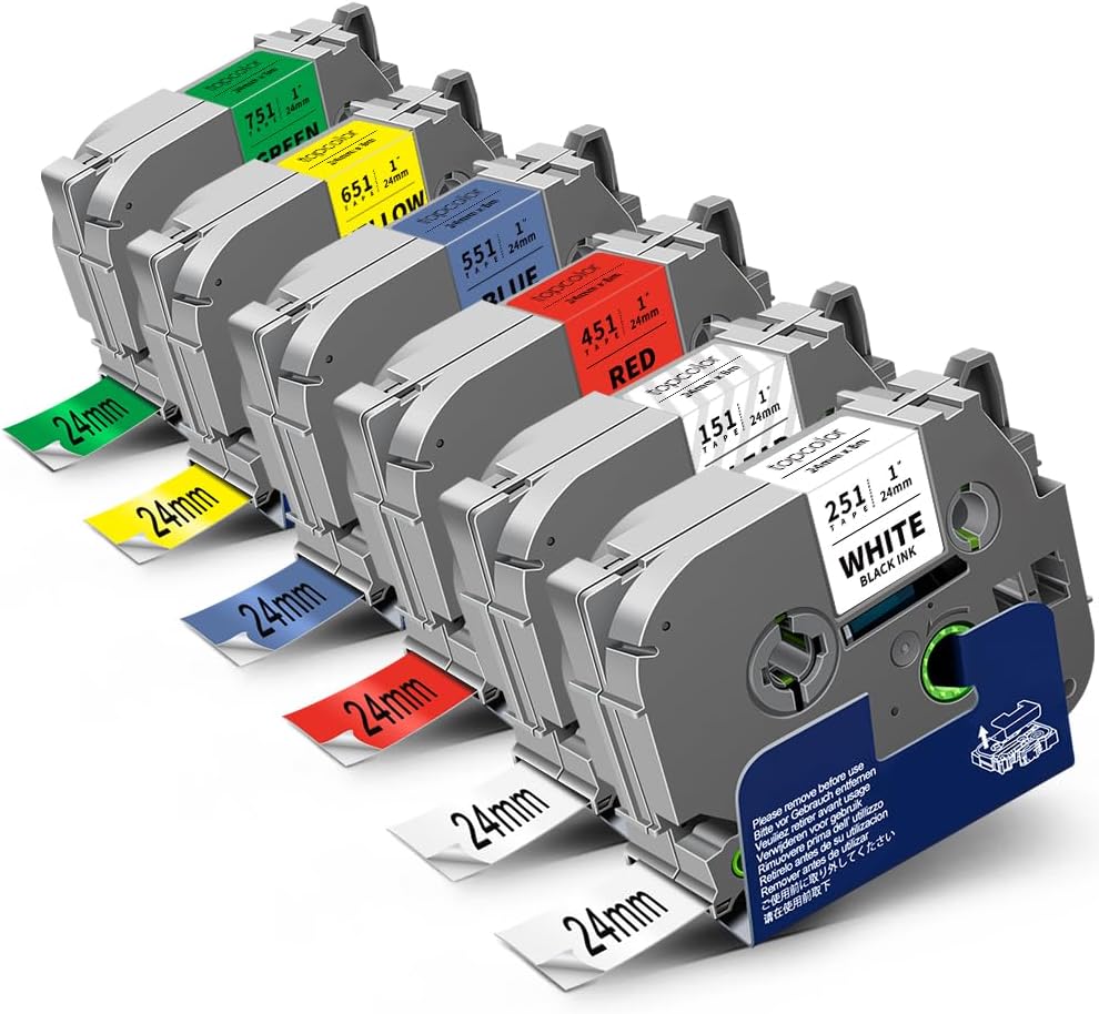 - Package Content: 6 Pack 24mm 0.94 label tape compatible for Brother ptouch tape 24mm 1 inch Tze-151 Tze-251 Tze-451 Tze-551 Tze-651 Tze-751 label maker refills tze tz 24mm 0.94 white tape. Size: 0.94 inch x 26.24 feet ( 24mm x 8m ). Color: Black on Clear/White/Red/Blue/Yellow/Green
