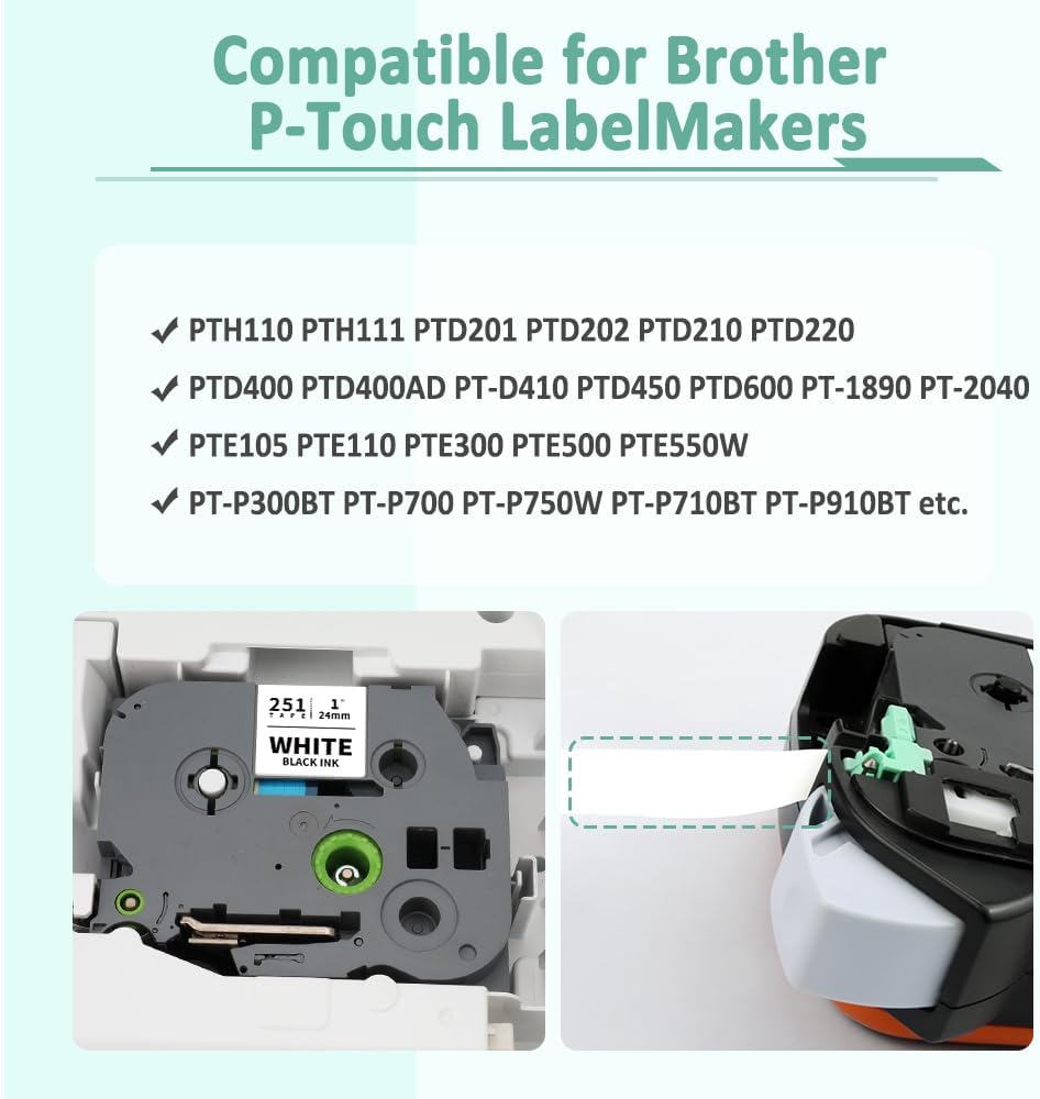 - Compatible with Brother P touch 24mm Label Makers: PTD610BT, PTD610BTVP, PTD600, PTP700, PTP710BT, PTE550W, PTP750W, PTE500, PTH500, PTP715eBT, PTD800W, PTE800W, PTP900, PTP900W, PTP950NW, PTP910BT, PT1500PC, PT1600, PT1650, PT2300, PT2310, PT2400, PT2410, PT2430PC, PT2500PC, PT2600, PT2610, PT2700, PT2710, PT2730, PT7500, PT7600, PT3600, PT9200DX, PT9200PC, PT9500PC, PT9600, PT9700PC, PT9800PCN