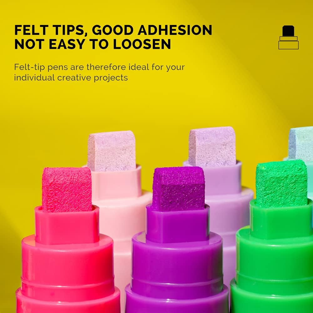 - [12 Vibrant Colors JUMBO Acrylic Paint Pens] Come with 12 vibrant colors, Jumbo size permanent with extra wide and highly visible lines, Felt chisel tip enable you to mark or draw on corrugate, wood, leather, metal, rock, plastic, ceramic and almost all surfaces, in wet or oily conditions.