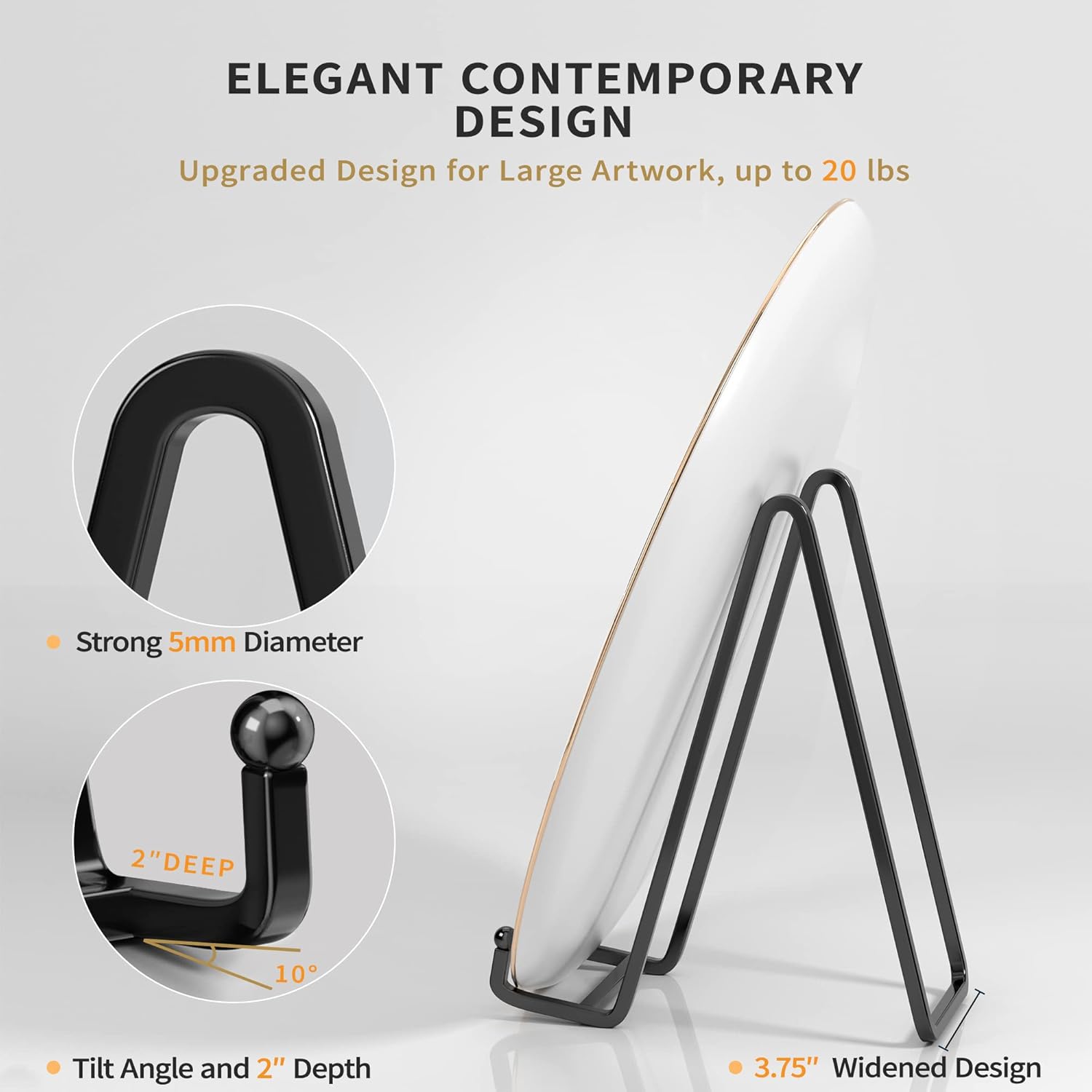 - DISPLAY STAND SPECIFICATIONS: - 8 inch large plate stand fits items of 9″ ~ 24″ Height / Diameter, Lip depth: 2" with a perfect 10° tilt angle design, and 3.75" widened design to hold heavy and thicker artworks, frames and plates up to 20 pounds(2 Pack)
