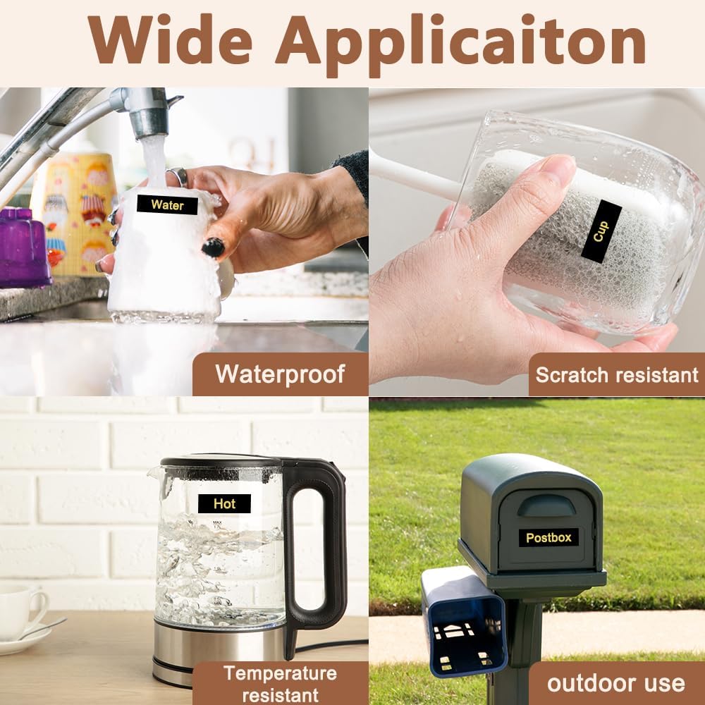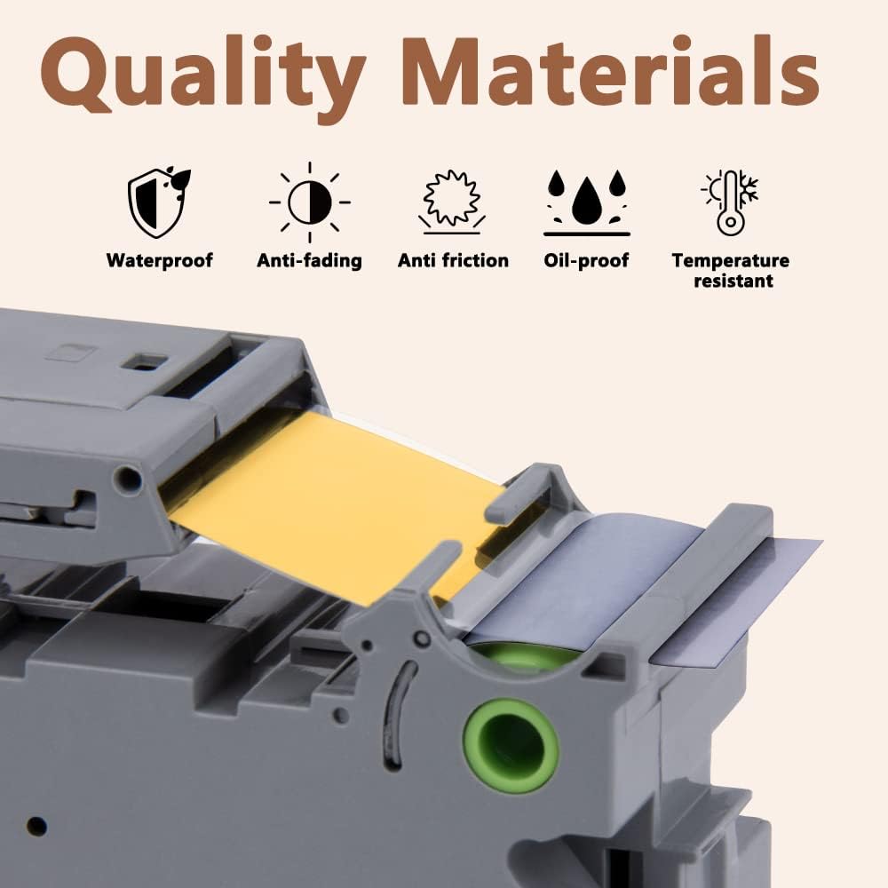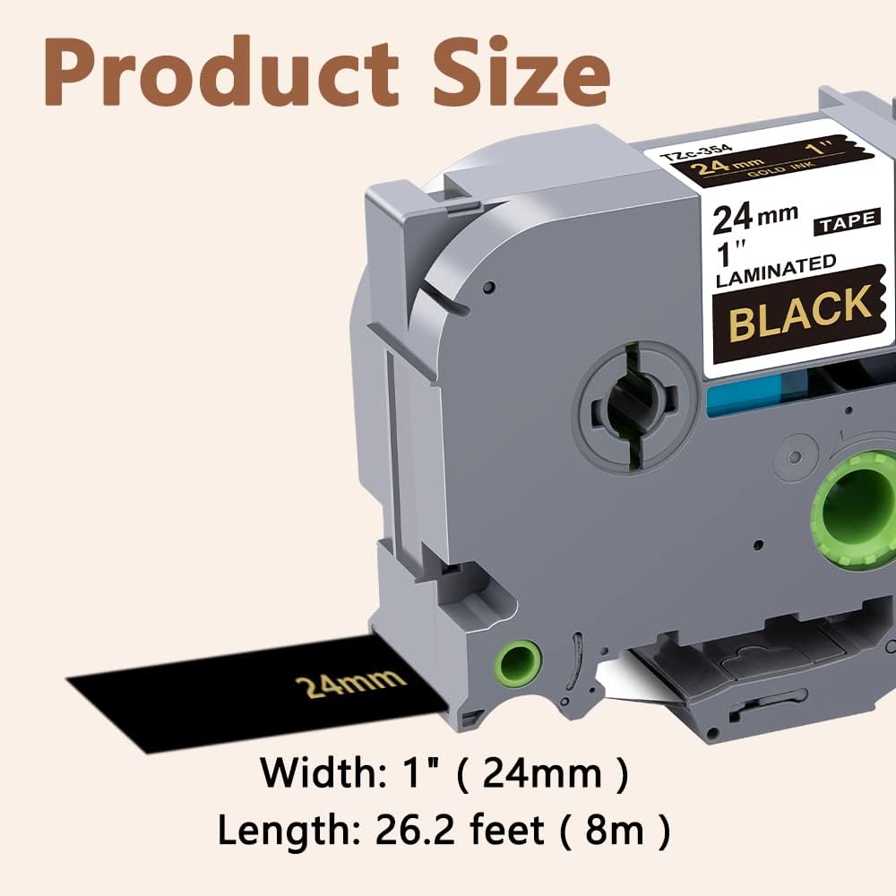 - Product features : Split back, water resistant, fading resistant, abrasion resistant, temperature resistant, strong adhesive. This compatibel label tape 24mm TZe-354 Gold ink on black is suitable for indoor and outdoor use