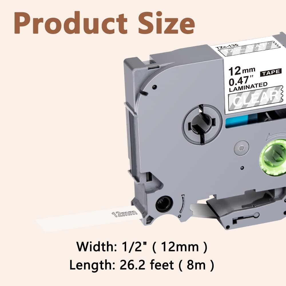 - 12mm label maker tape clear TZe-135 is compatible for Brother label maker PTD200 PTD210 PTD220 PT-D400 PT-D600 PT-E110 PT-H100 PT-H110 PT-P700 PT-1180 PT-1280 PT-1830 PT-1880 PT-2430PC. Please refer to label maker list for more printer model