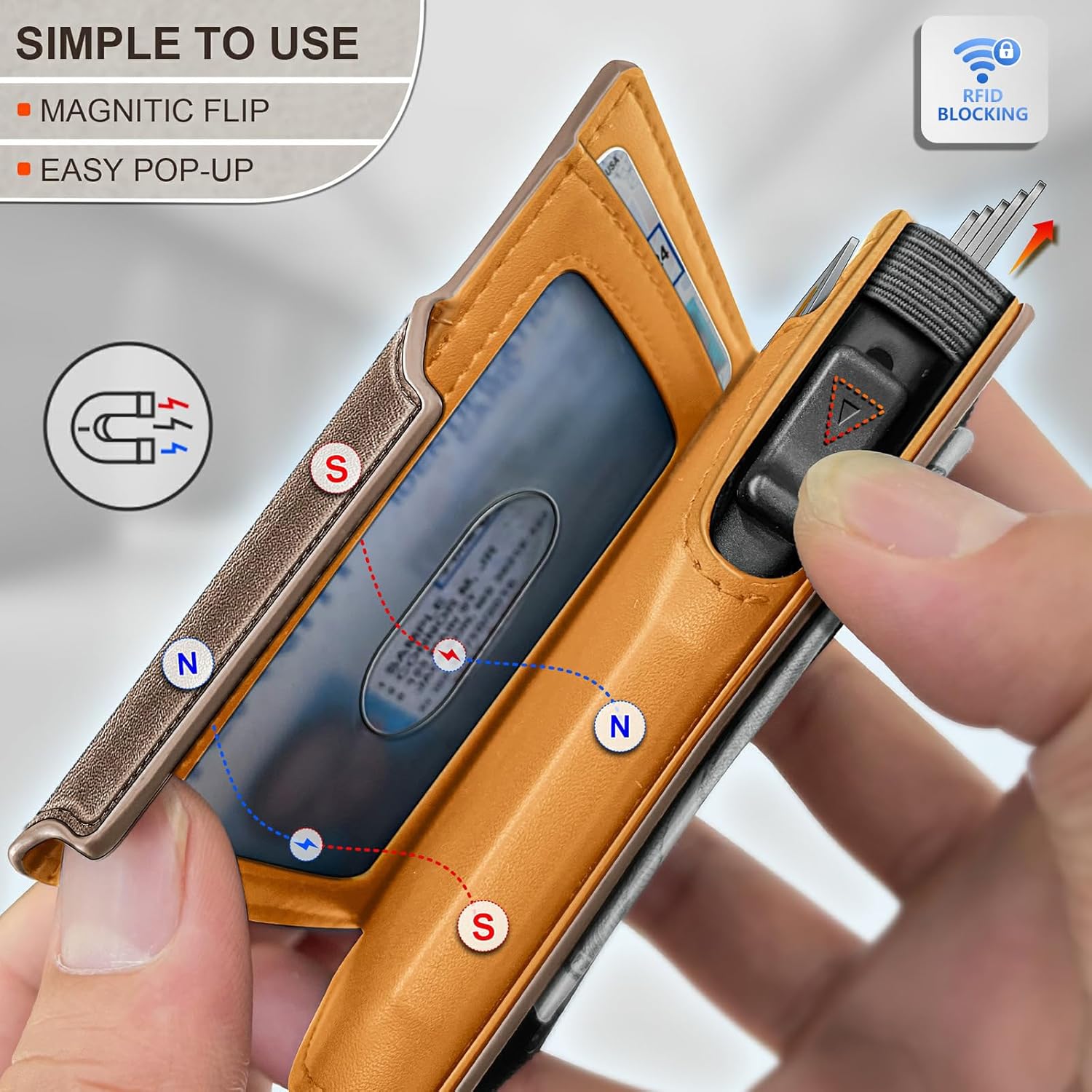- CAPACITY-Slim wallet with refined layout to fit in front pocket,easy for 8 cards(including 1 ID card)and couple of bills--5 cards in the aluminum case with pop-up access,2 cards and 1ID slot in the leather shell;