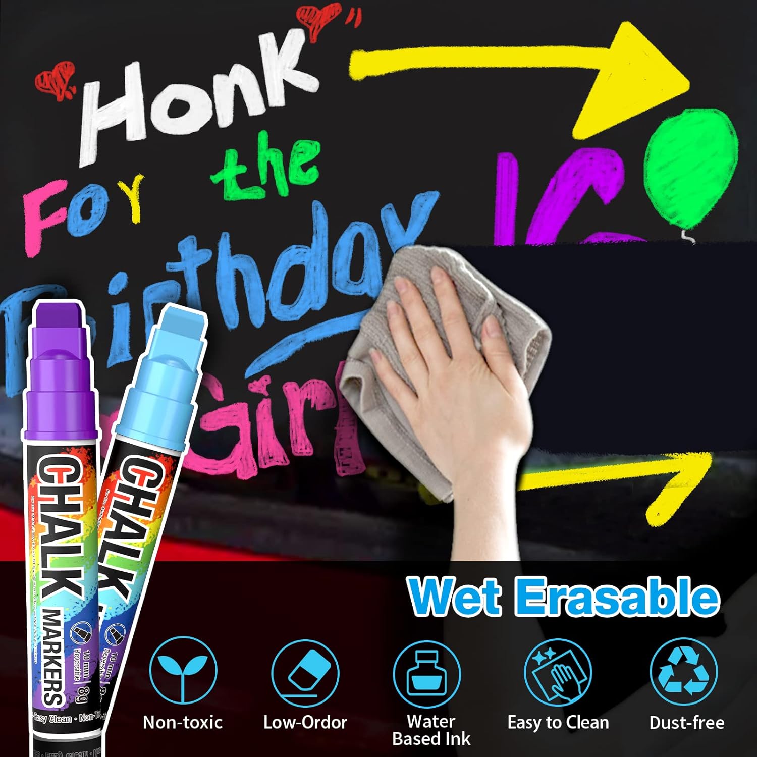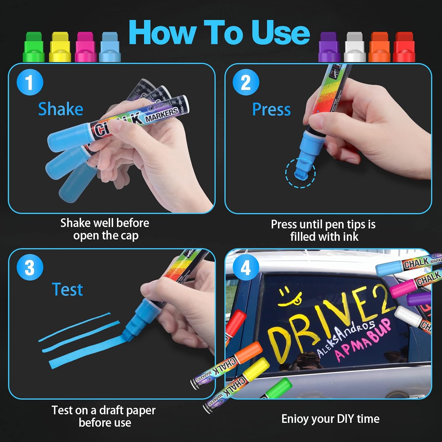 - 【Perfect Car Window Markers】 Set of 8 Jumbo liquid chalk markers come with 10mm 3-In-1 large nib and bright neon colors, each car window marker's rectangle thick tip provides 3 different line width options - wide lines, bold lines & fine lines, this set of chalk markers will meet all your paint drawing needs